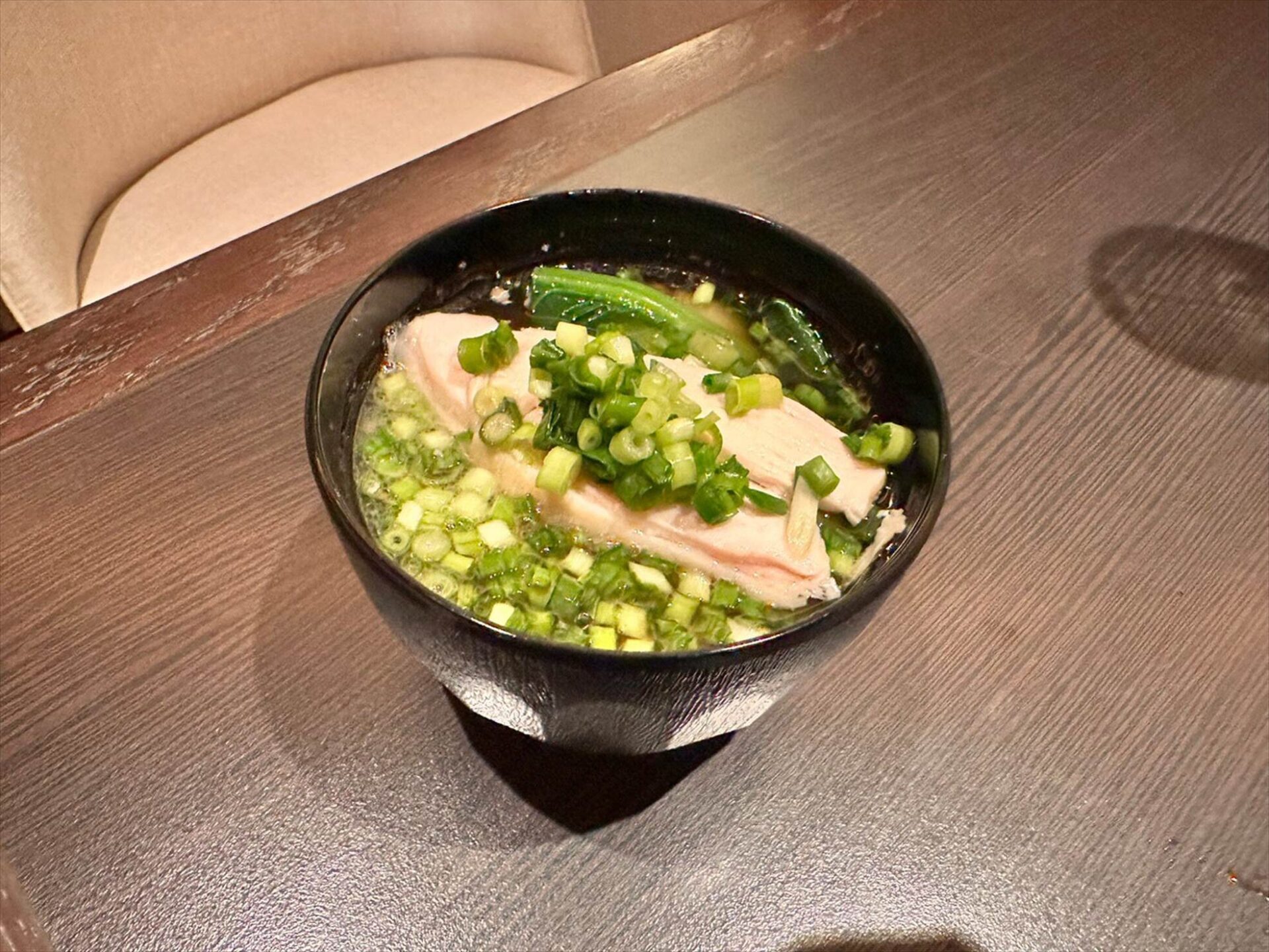 エビ・蒸し鶏を投入しネギとほうれん草でトッピングしたシンプルなラーメン。