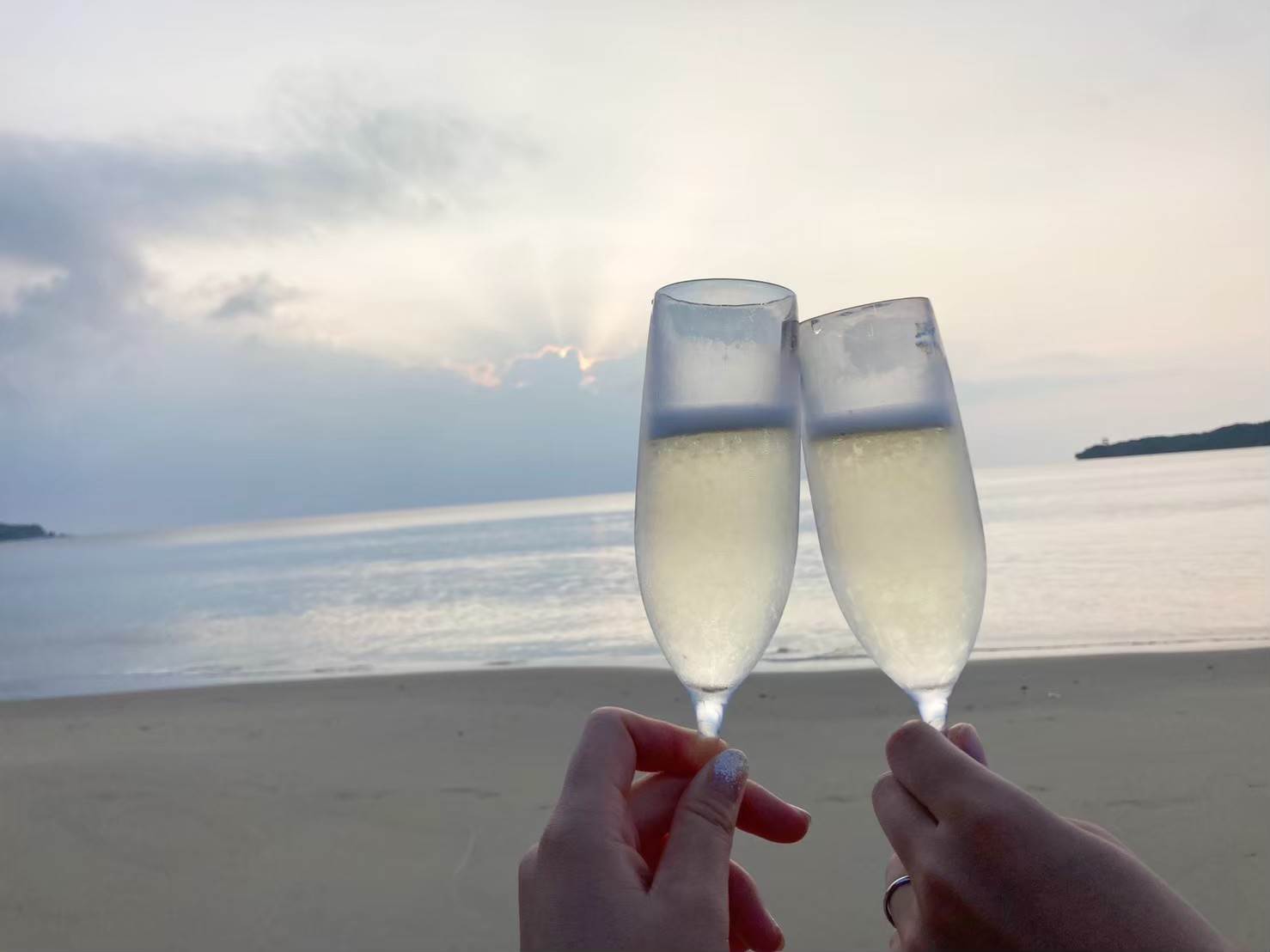 ちょうど日が沈む場所に分厚い雲がかかってしまいましたが、暑さがまだ残る空気の中、ビーチでスパークリングワインを楽しむ非日常すぎるシチュエーションが最高です。