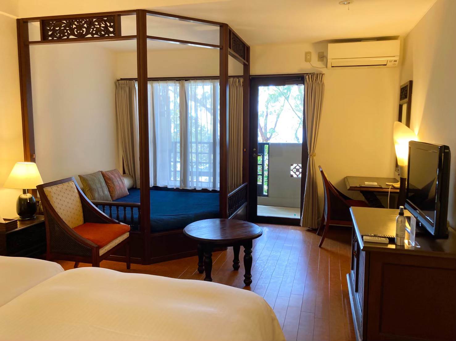 ▲客室の様子がこちら!手前にツインのベッドと、奥にテラスとデイベッドが用意されています。