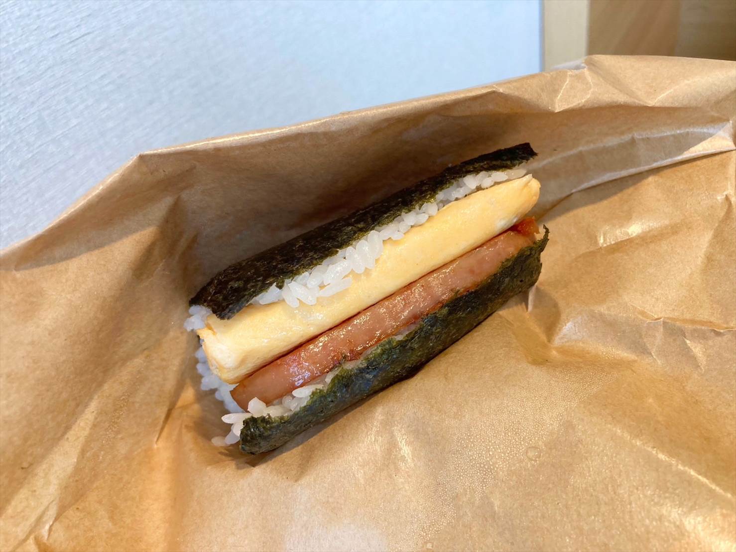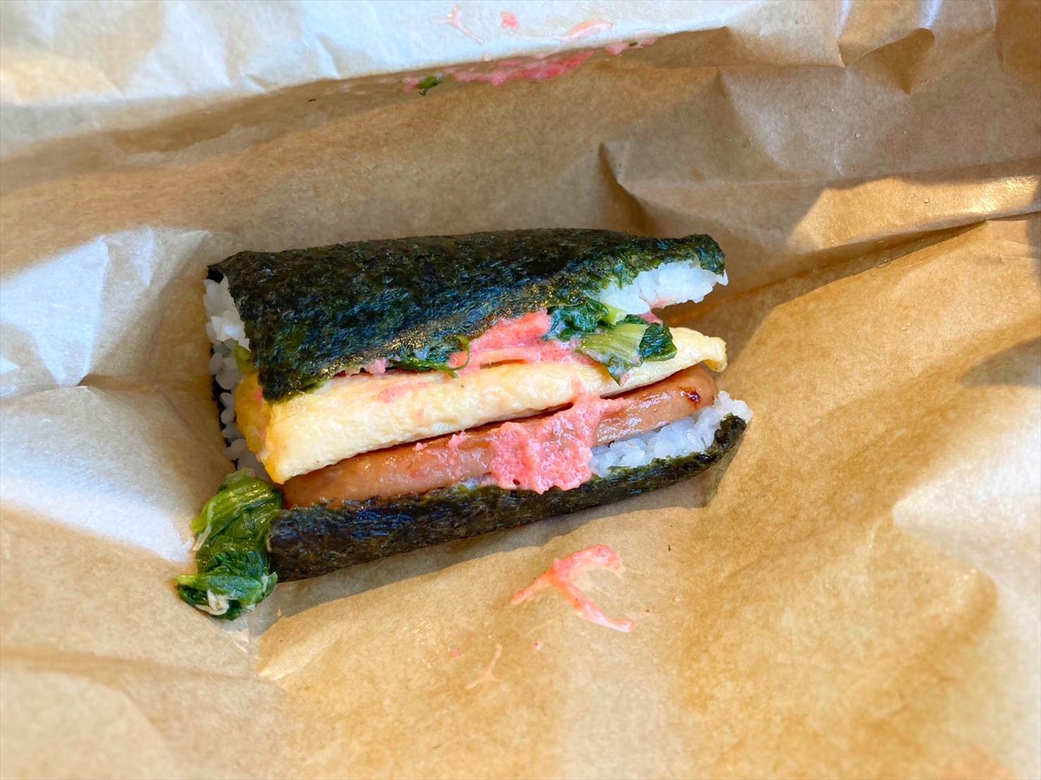できたてのおにぎりは思ったよりもアツアツで、ジューシーなスパムと濃厚なたまごの味がたまらない…。