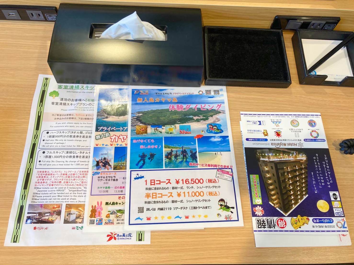 ▲机の上にはミヤヒラが提携・主催する各種アクティビティの案内も。