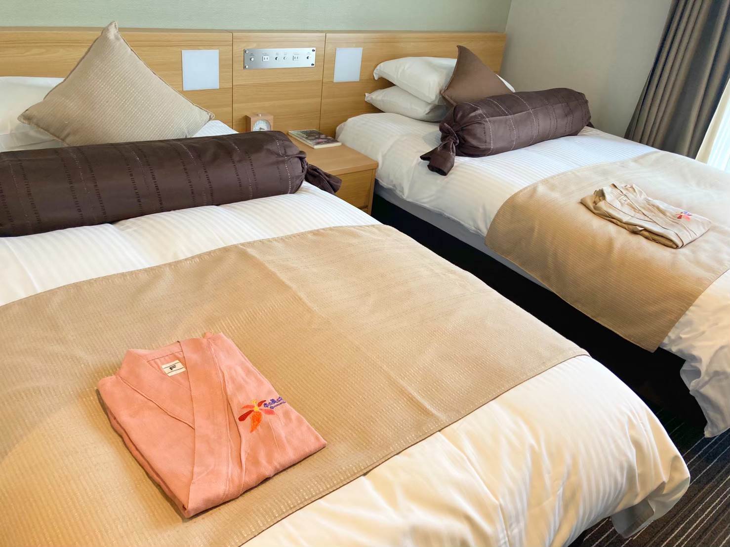 ▲ベッドはツインタイプ。それぞれ枕が一人二個ずつ用意されており、ゆったり休めました◎
