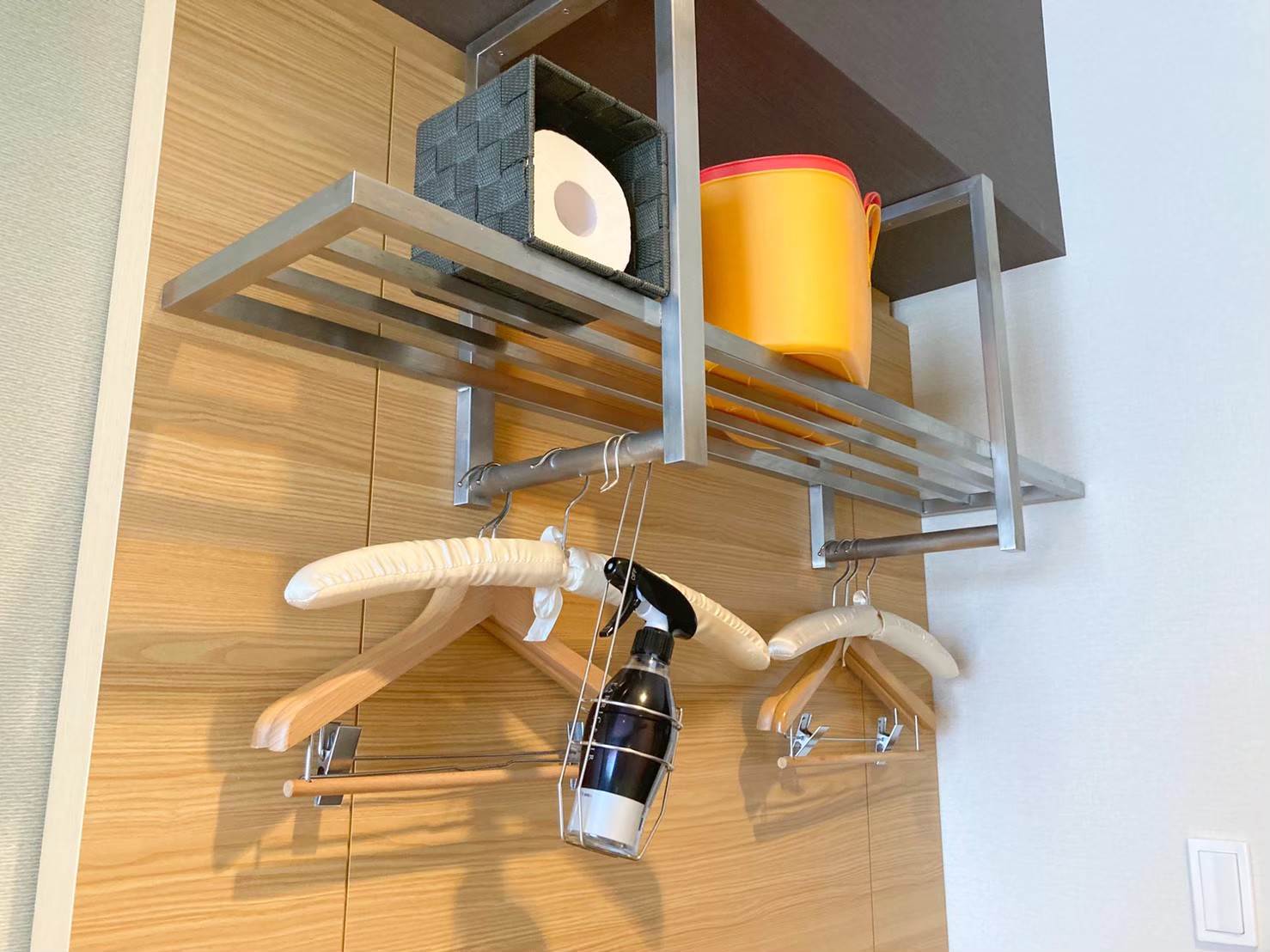 ▲お部屋入ってすぐの場所にハンガー・消臭スプレー等の備品が用意されています。