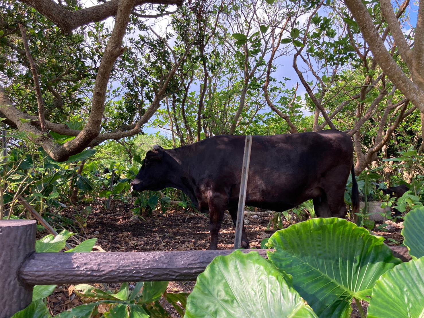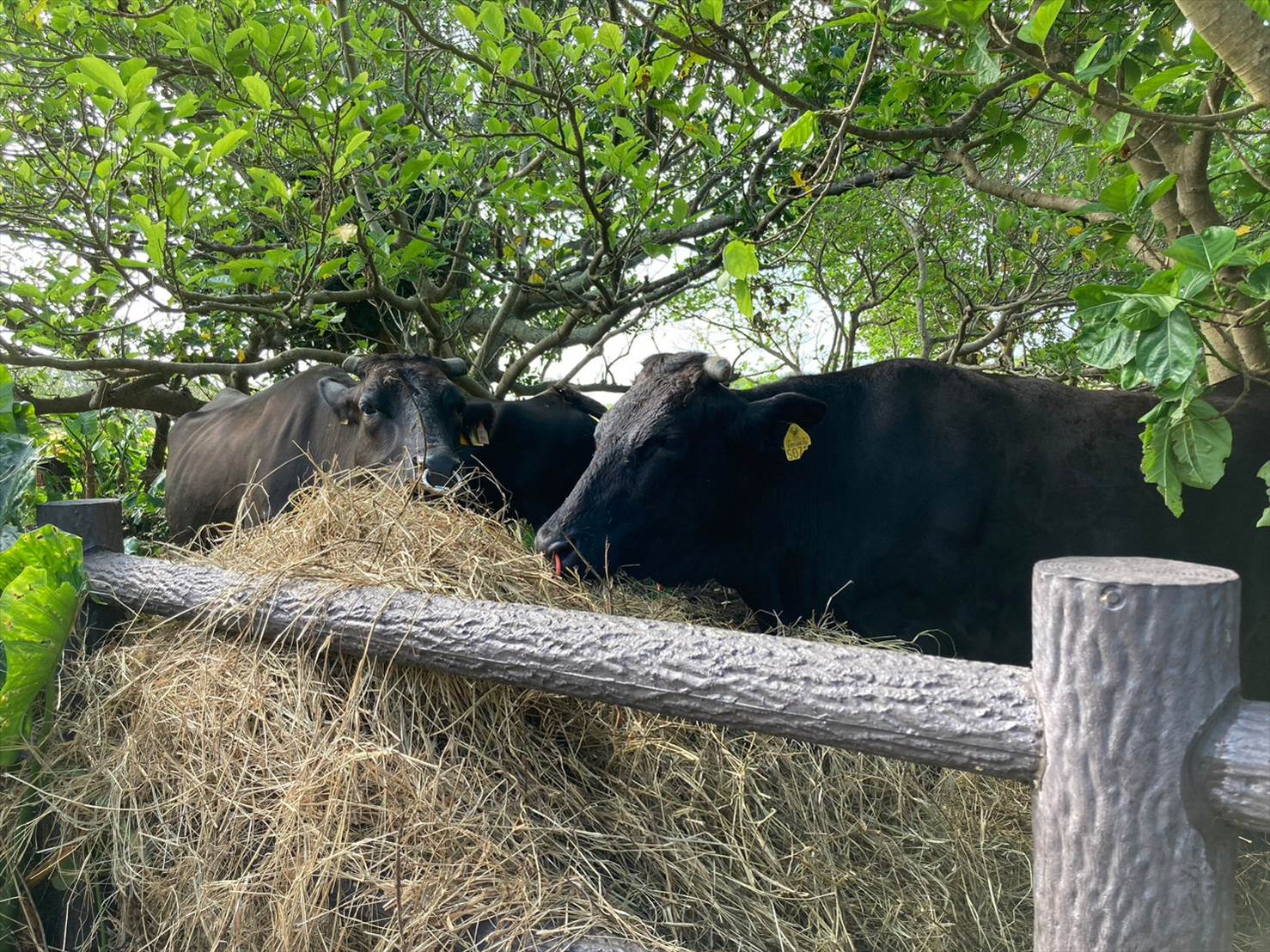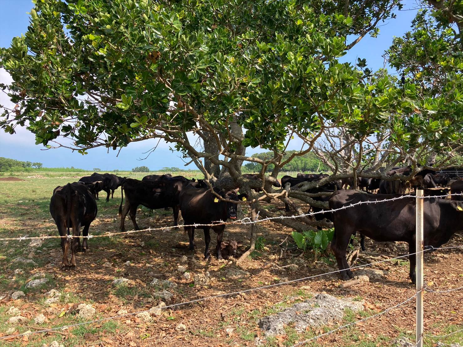 ▲牛にとってもやはり黒島の気候はこたえるのか、ほとんどの牛さんが木陰で涼んでいました。
