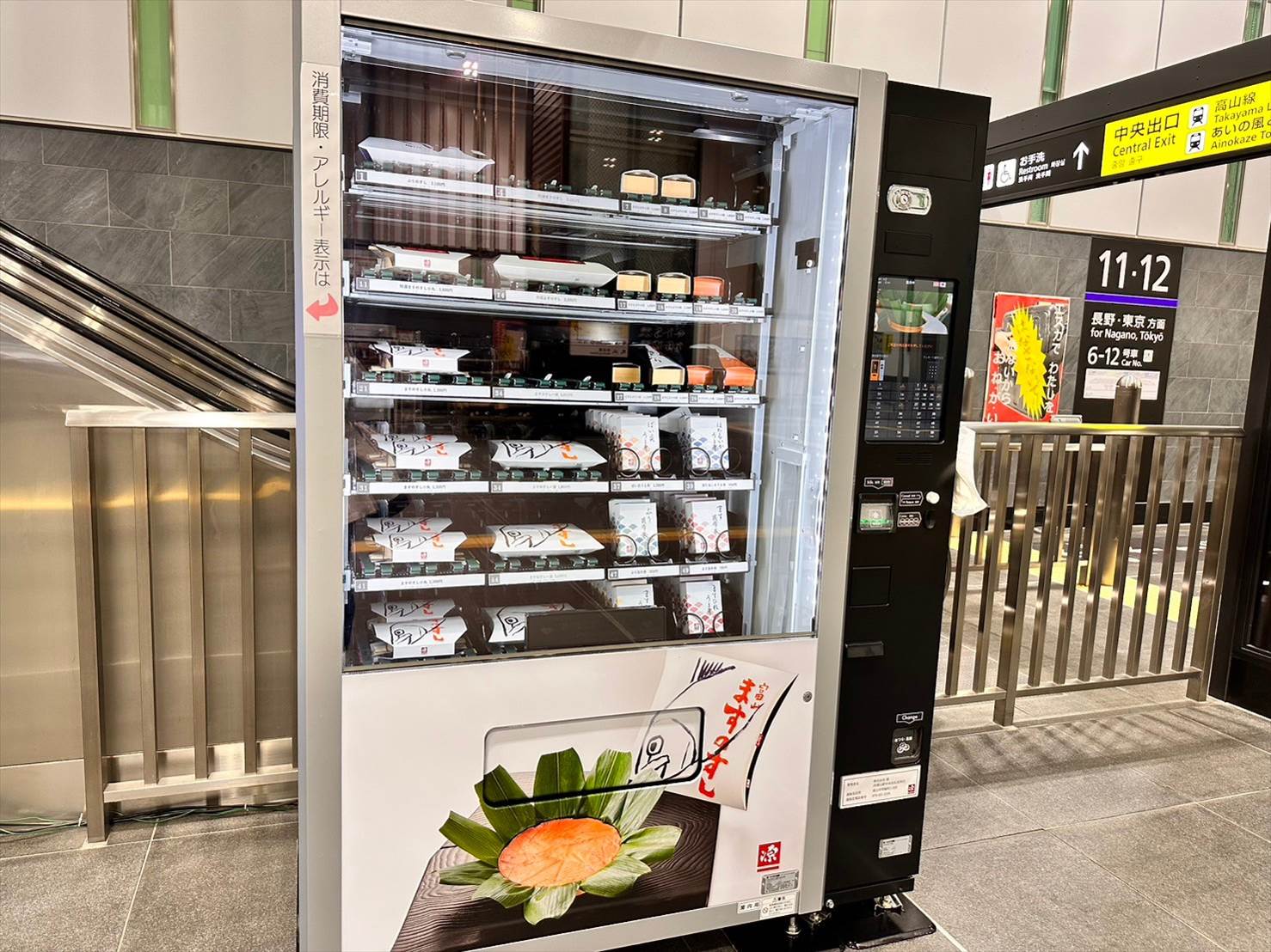 改札を超えたところで、ますのすしの自動販売機があるのを見つけました。買い忘れた人でもこれで安心ですね。