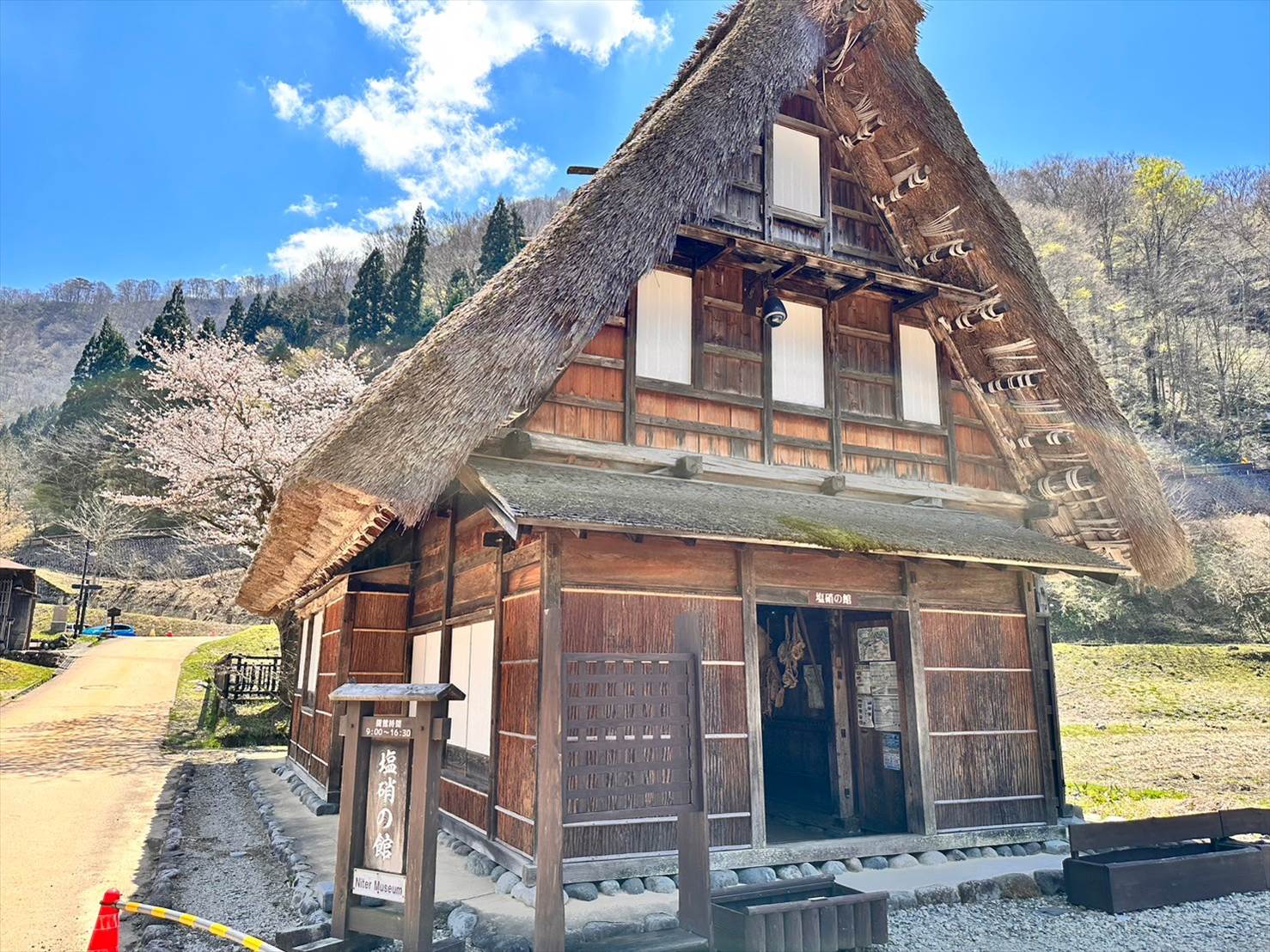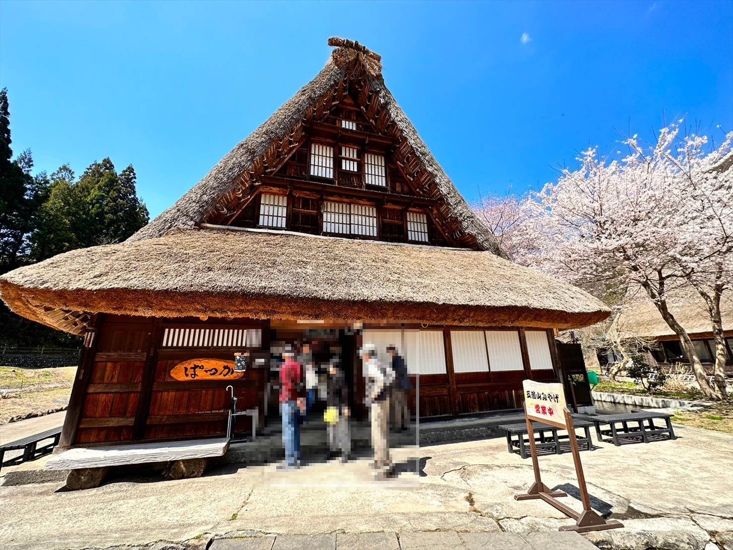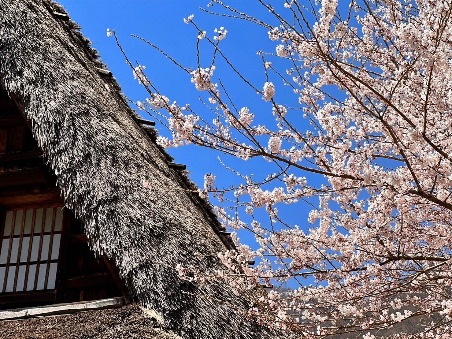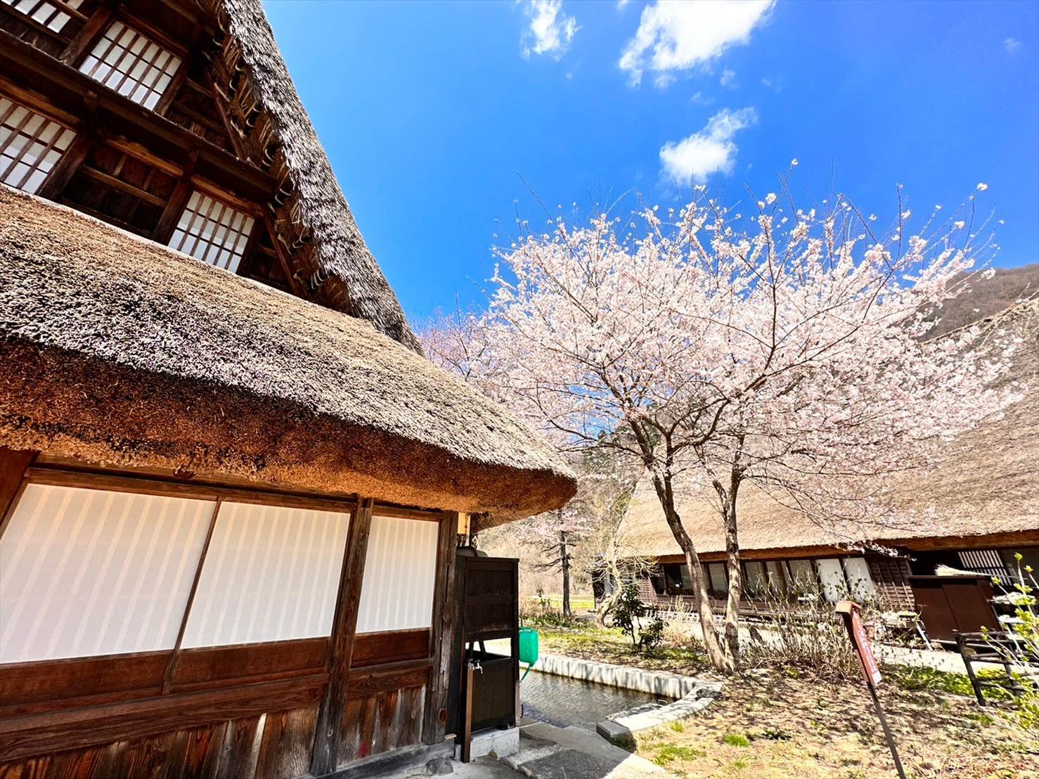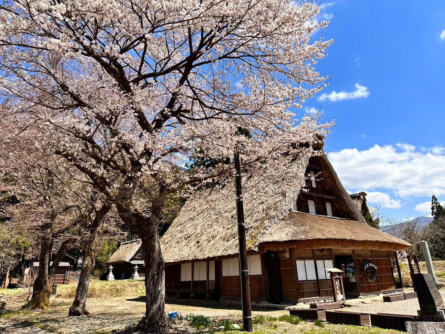 ▲立派な桜と藁屋根の合掌造りの家が素敵です。