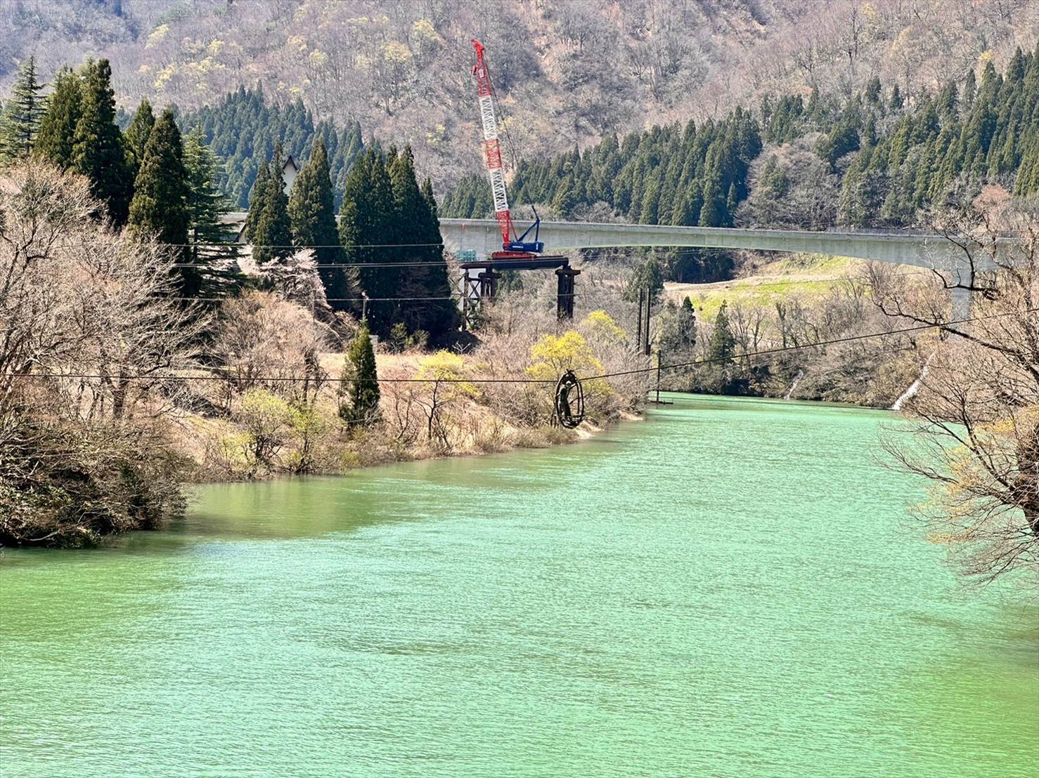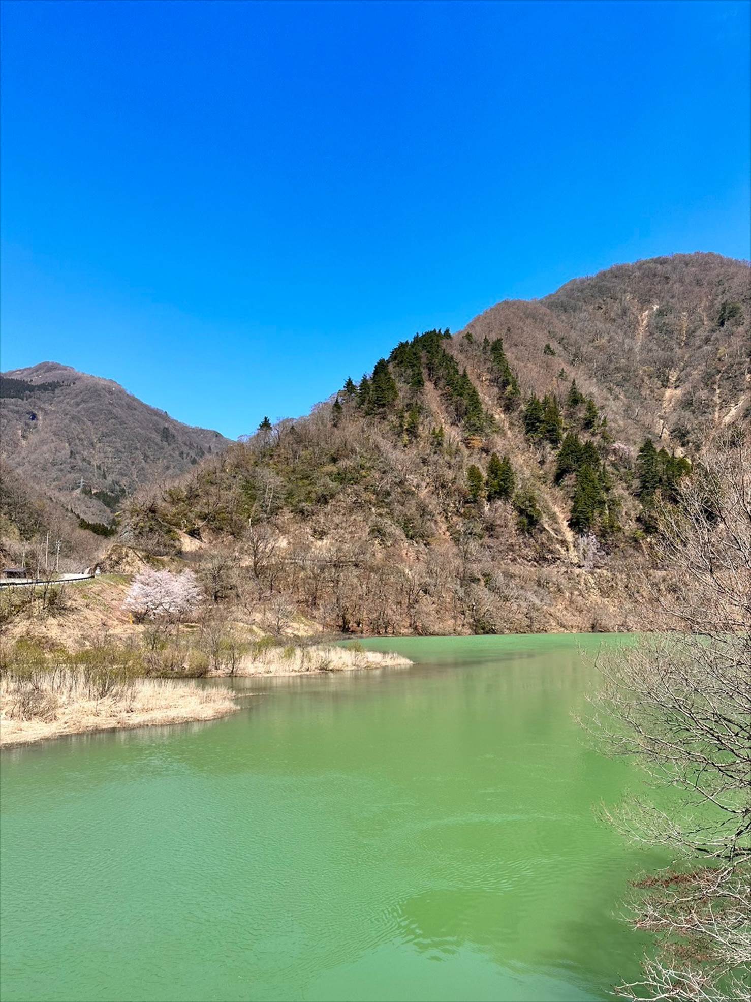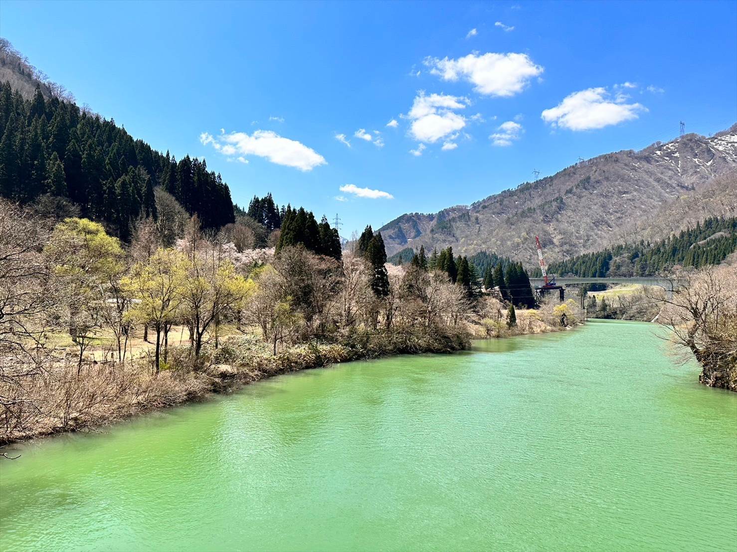 遠くの山、近くの桜、そして眼下に流れる鮮やかなグリーンの川。なんともまあ綺麗な光景ですね…!