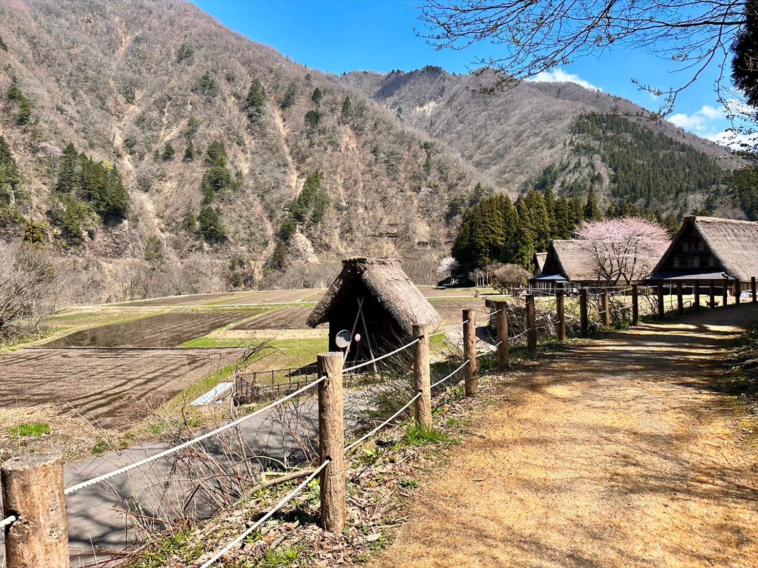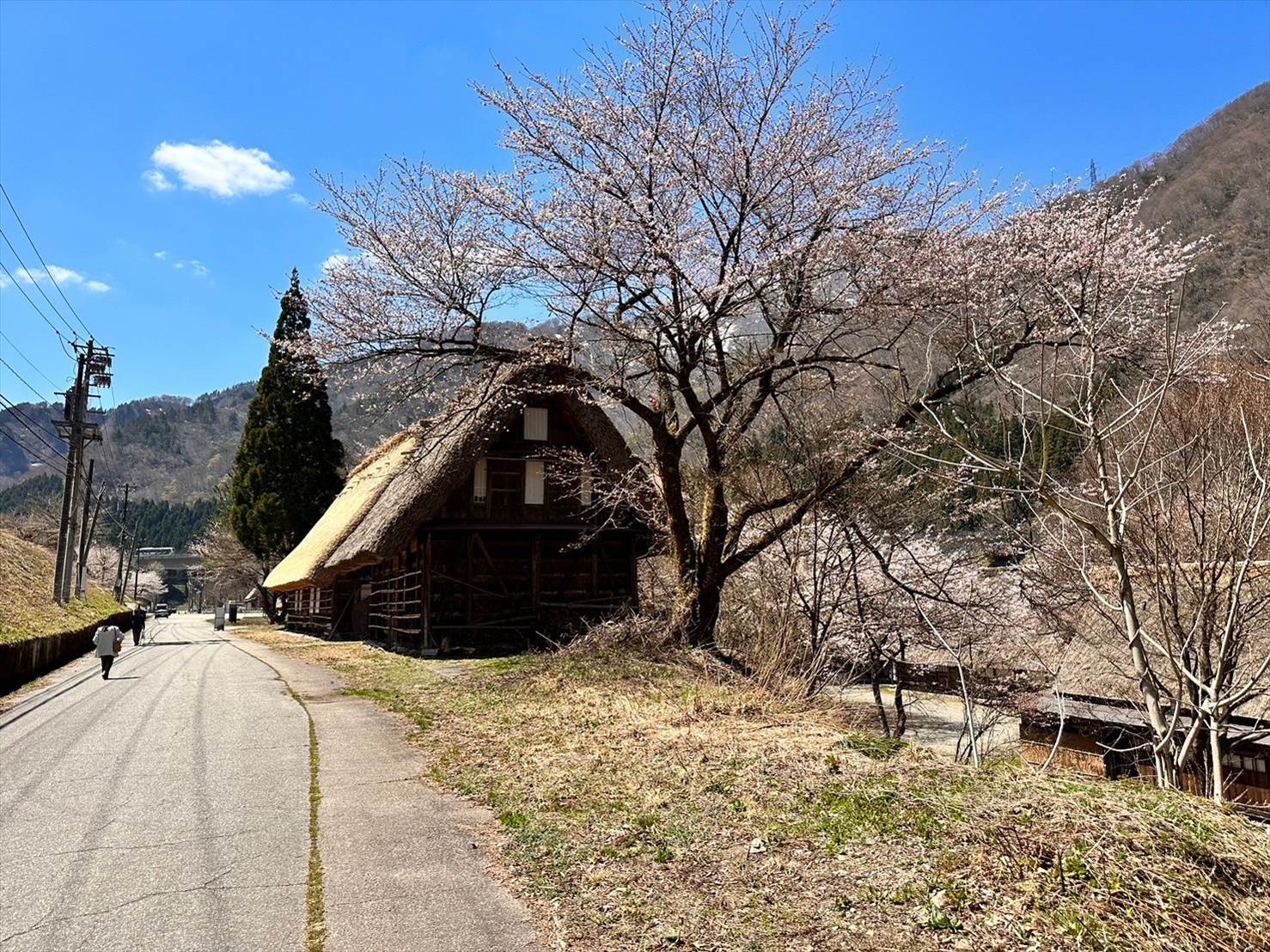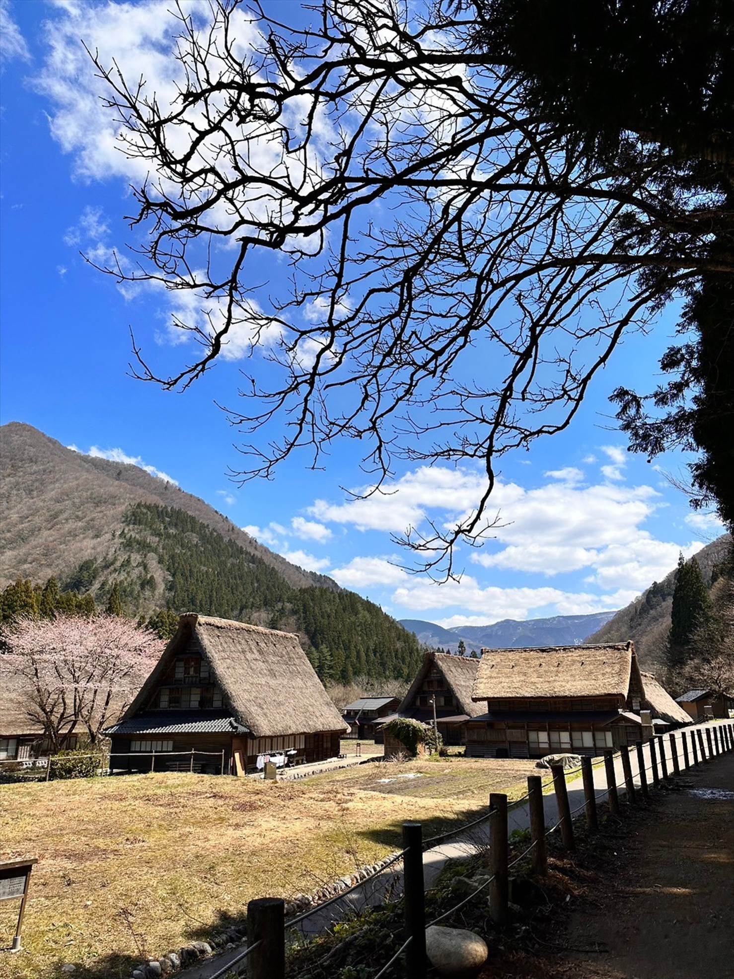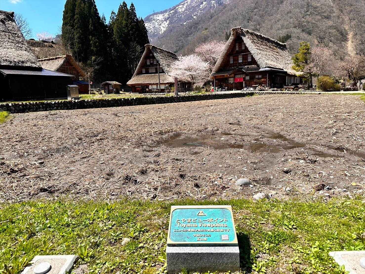 奥の山がいい感じに雪をかぶっているのと、手前の合掌造り集落、そして桜とのコラボが一挙に味わえる素敵な景色でしたね。
