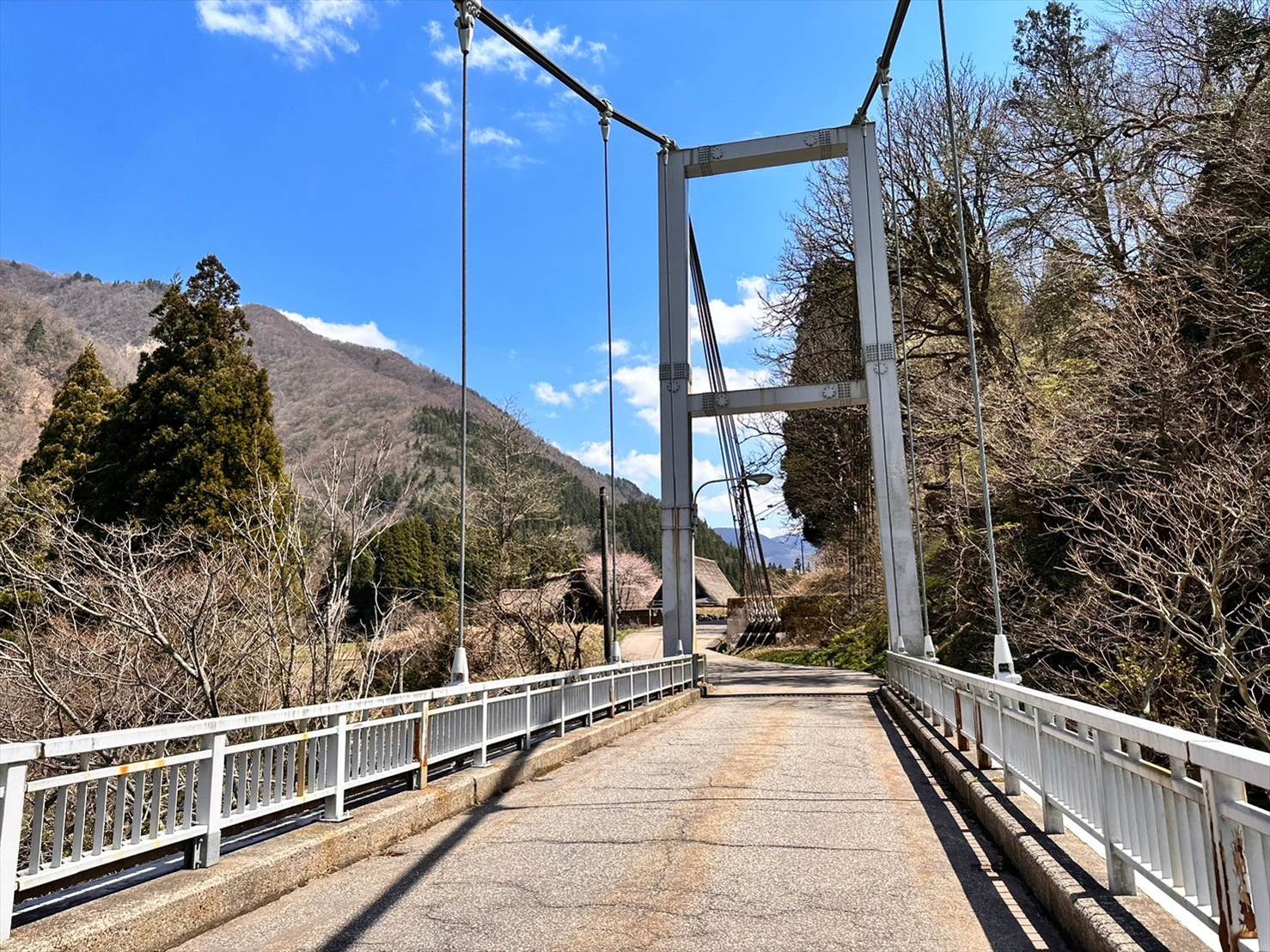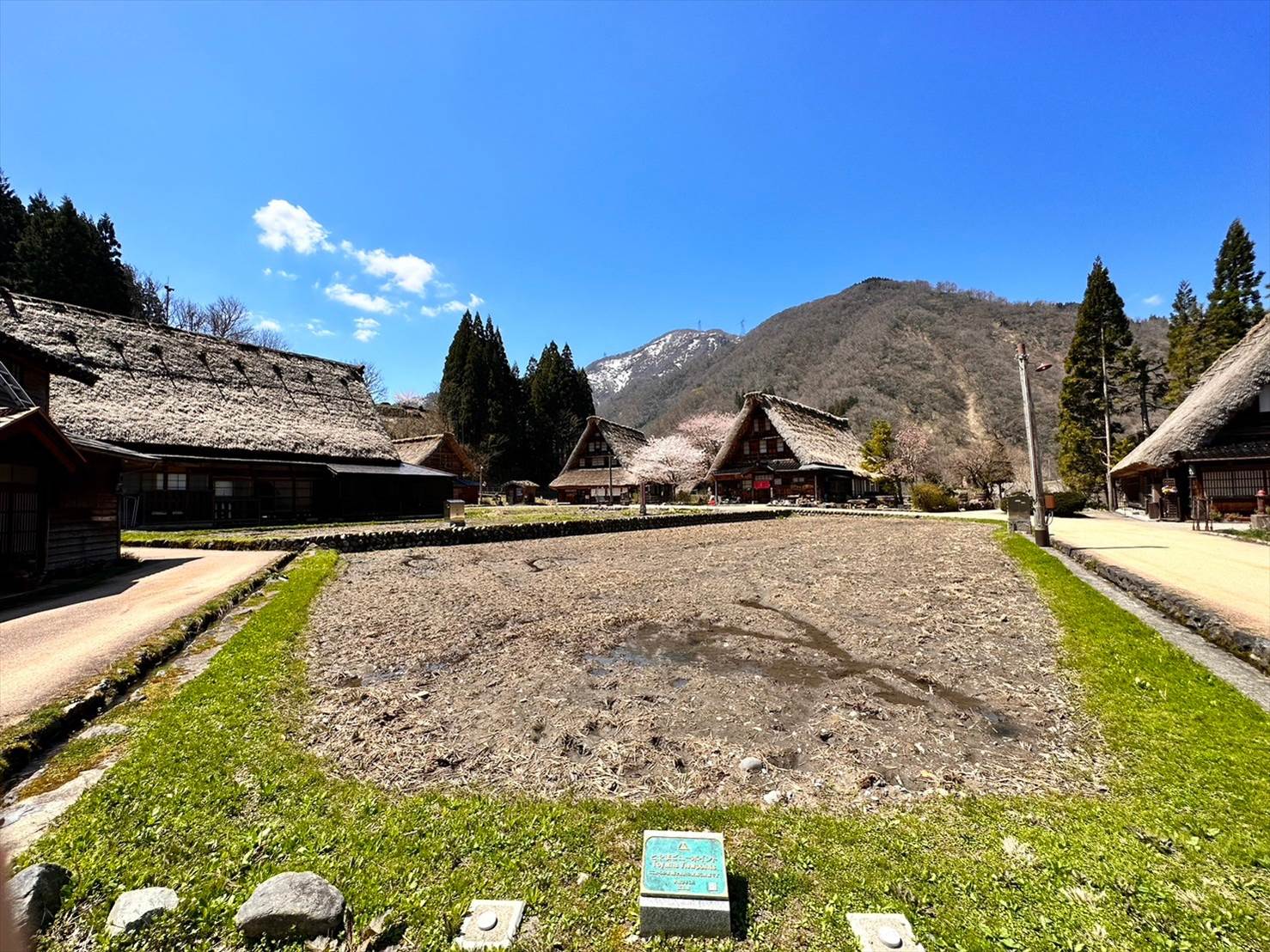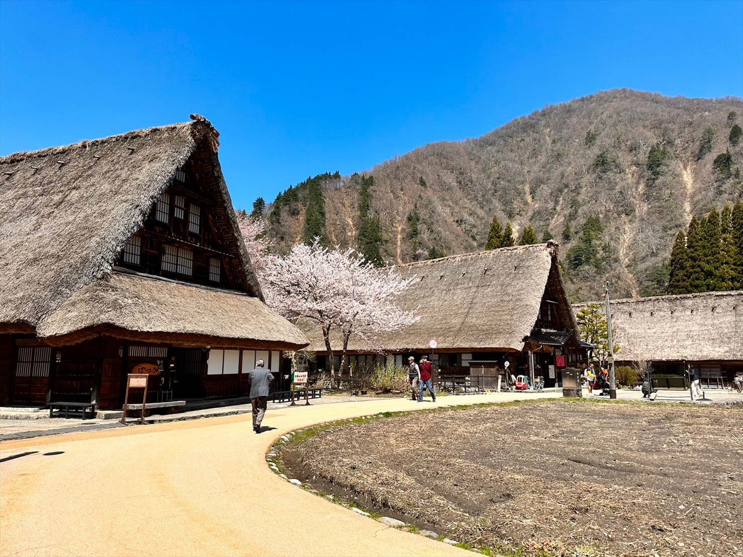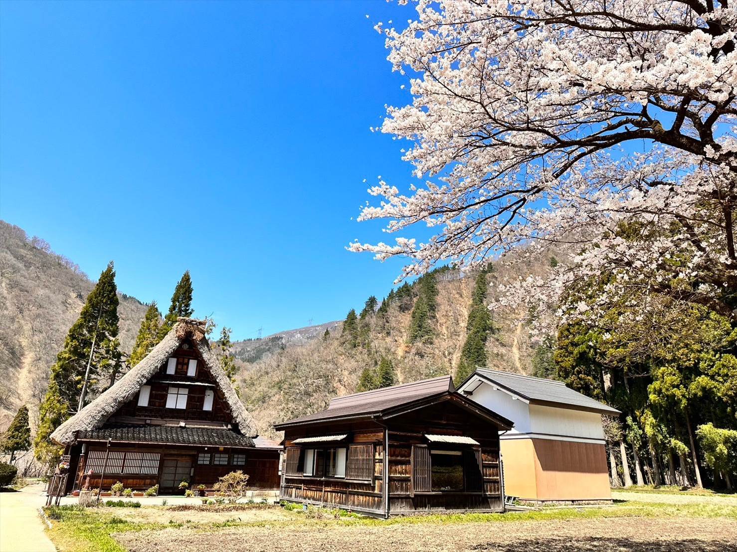 奥の山がいい感じに雪をかぶっているのと、手前の合掌造り集落、そして桜とのコラボが一挙に味わえる素敵な景色でしたね。