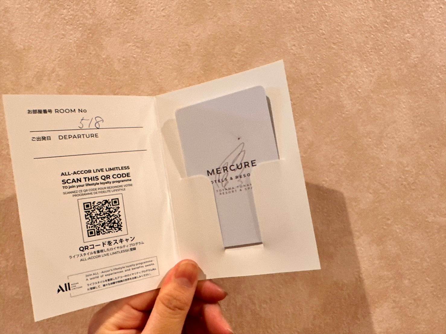 ▲お部屋はカードキータイプで、こんなふうにメルキュールのロゴ入りの紙に入れて渡されました。