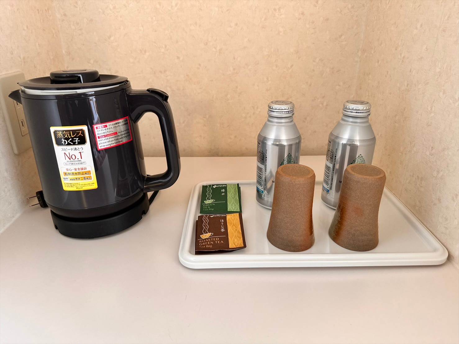 電気ケトルと、缶入りのお水、ほうじ茶・緑茶が人数分用意されています。