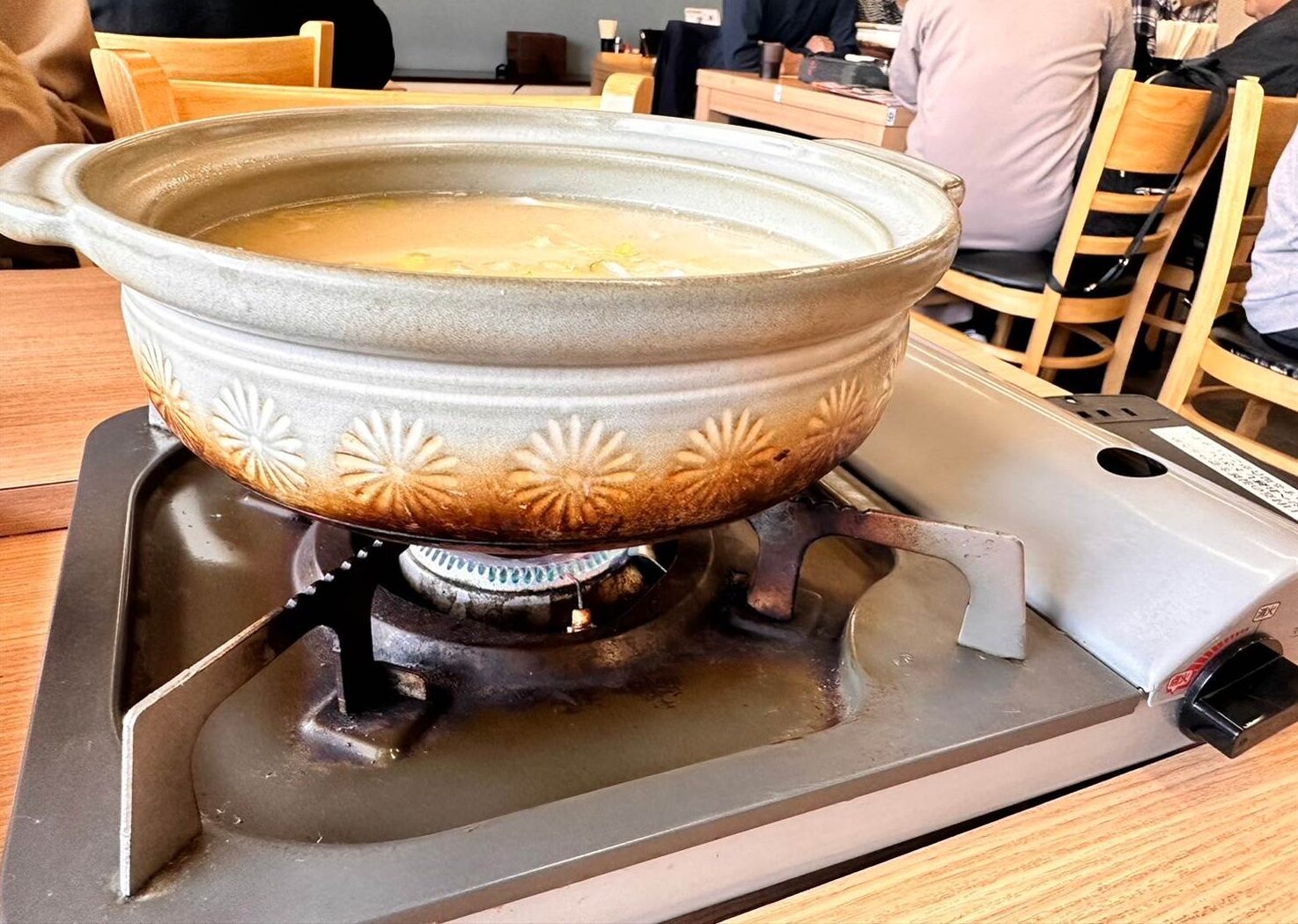 漁師汁は土鍋にこれでもか!というほどがっつり注がれており、これを卓上のコンロでぐらぐらに温めていただく見慣れないスタイルで面白かったです☺️
