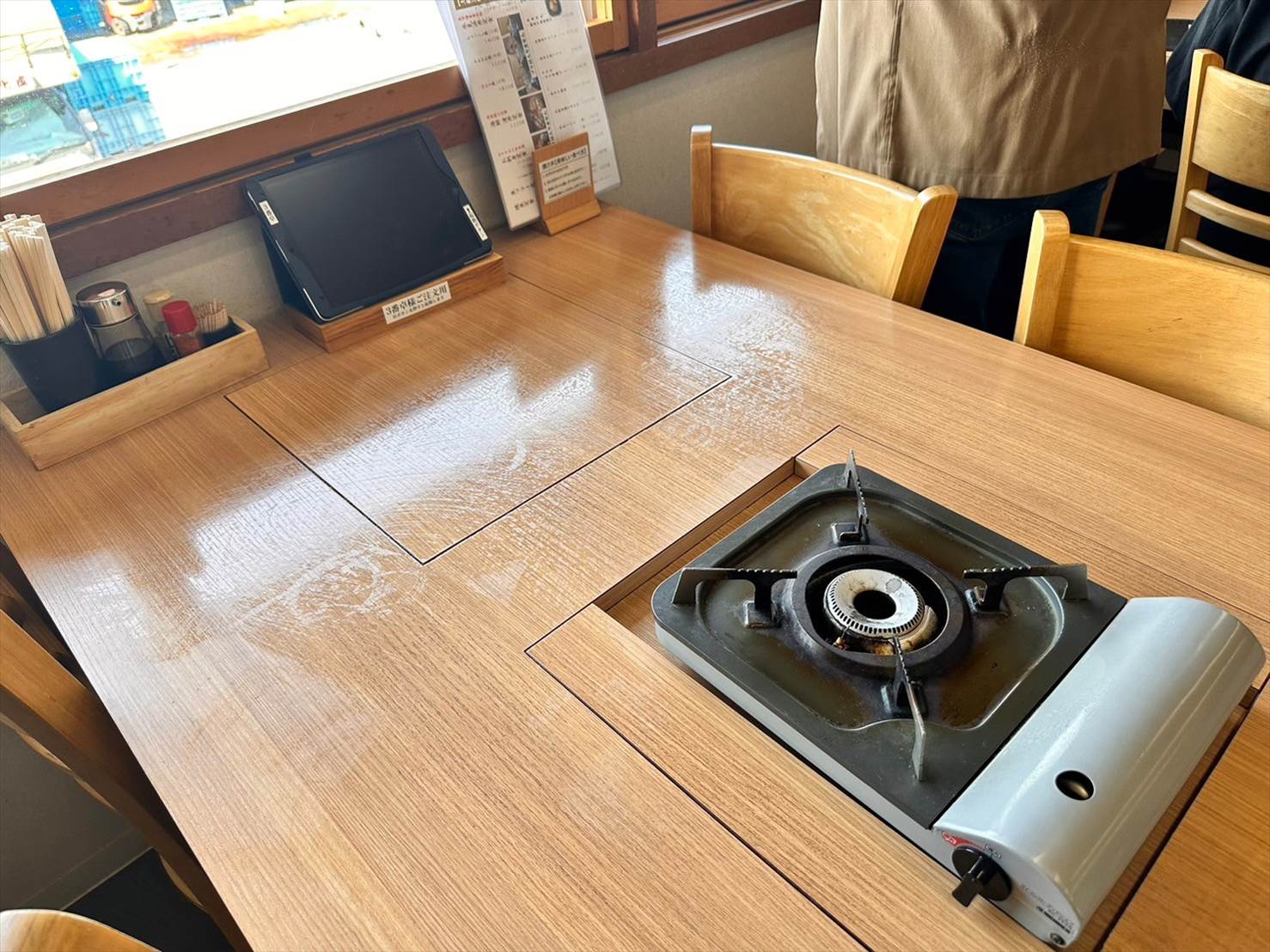 ▲席にはあらかじめガスコンロがテーブルにセットされていました。