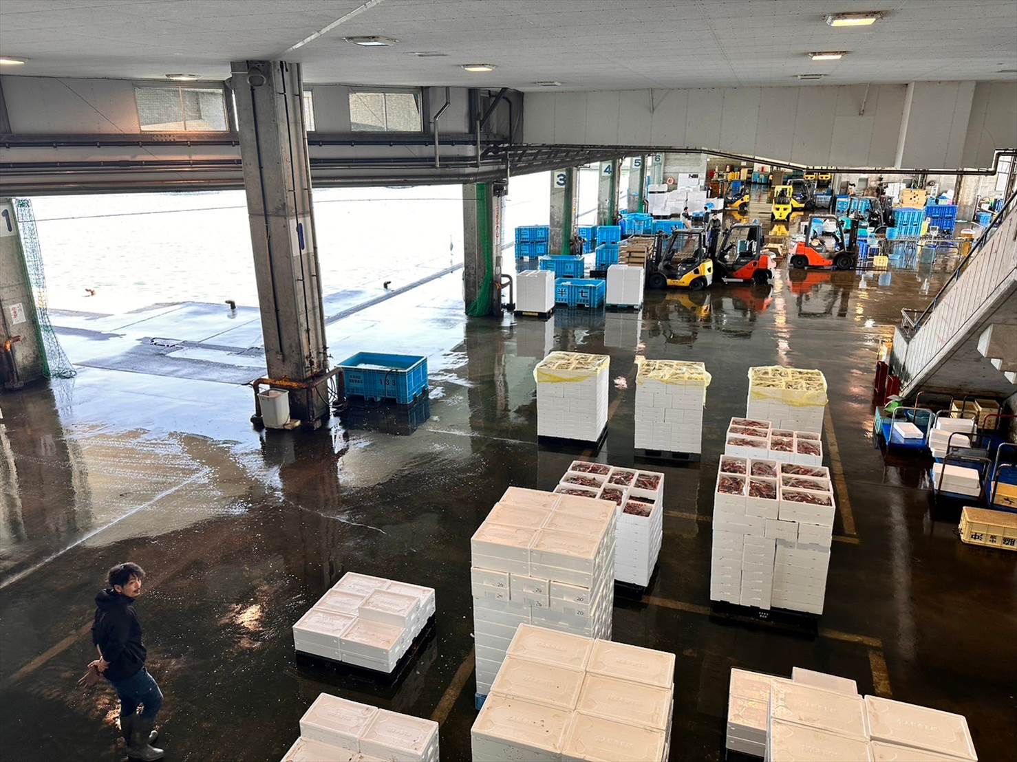 競り場から数メートルの位置で、競り落とされた魚が直接届く。