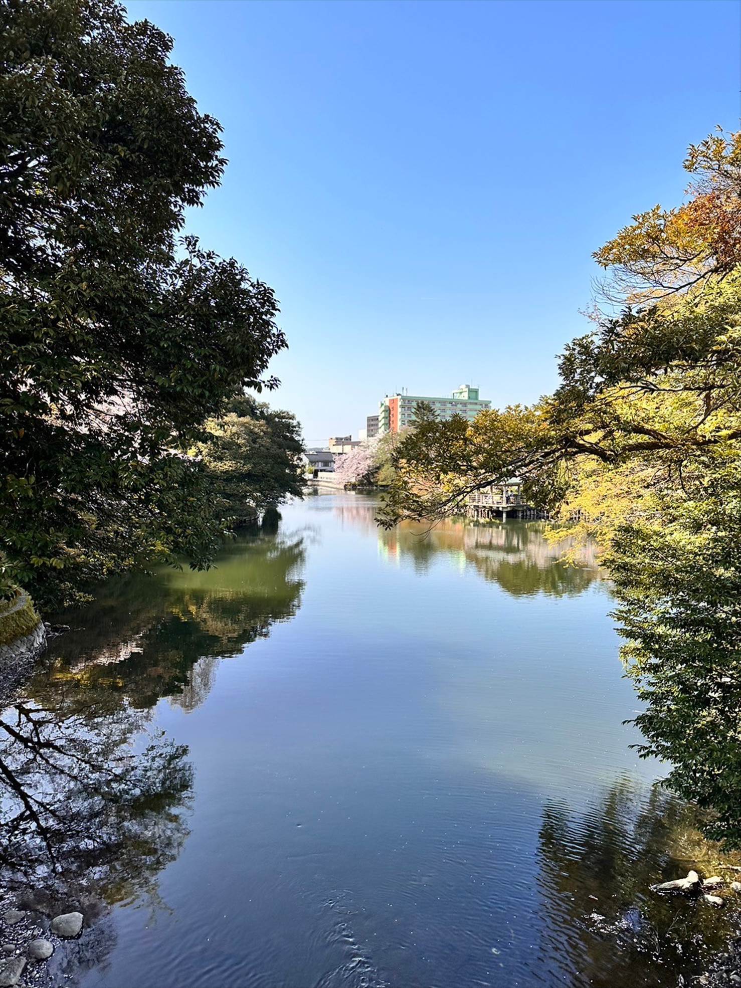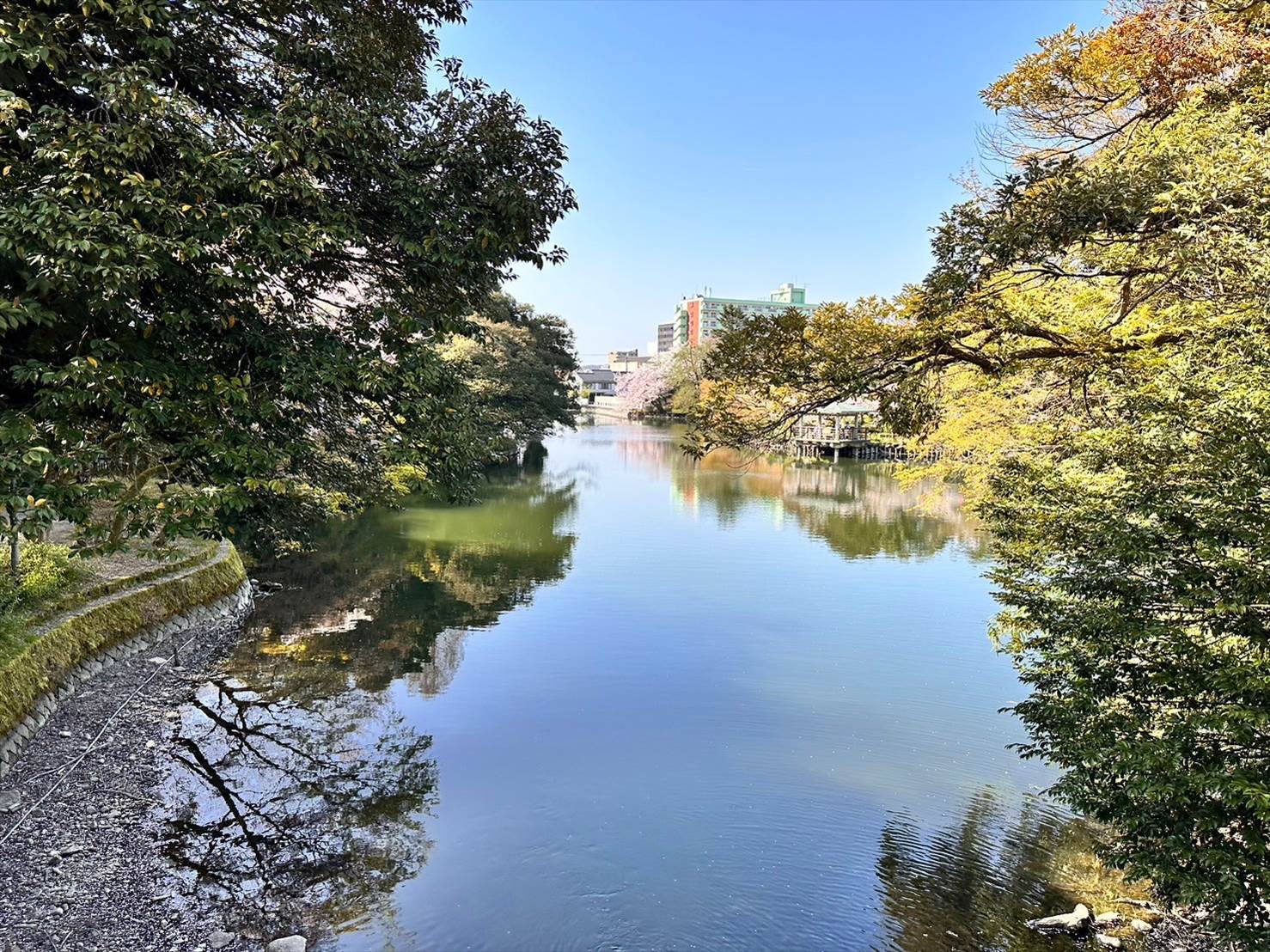 緑と青空、水濠との景色がもう見事です。奥にちょっとだけ見える桜も良い。