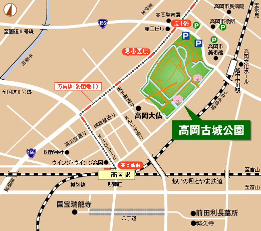 高岡古城公園は公共交通機関もしくは車でアクセスすることができます。