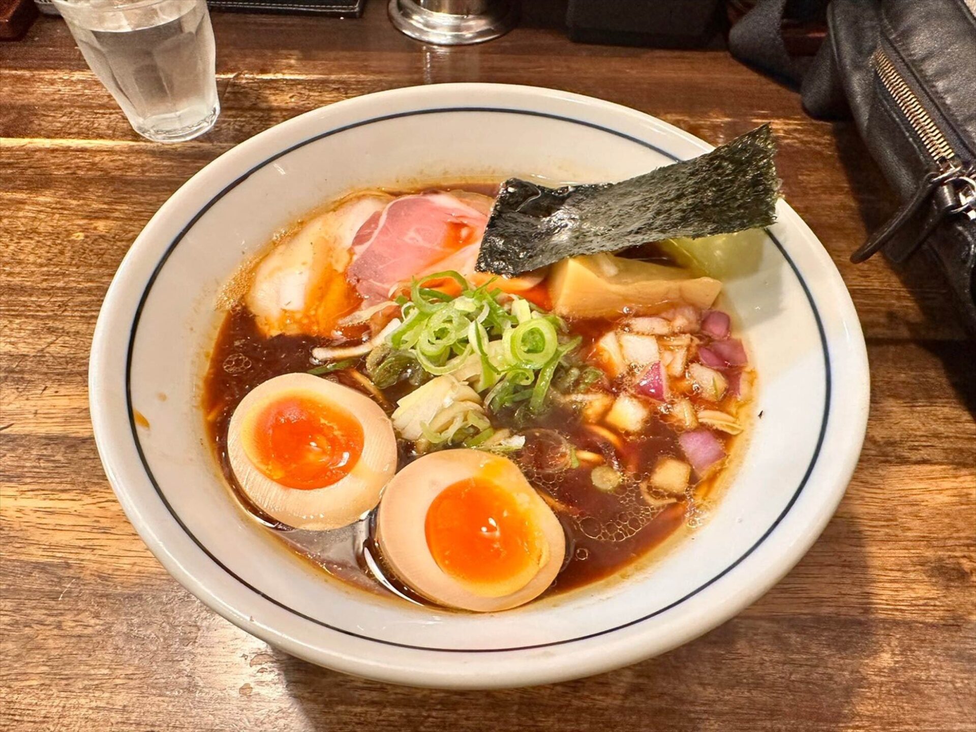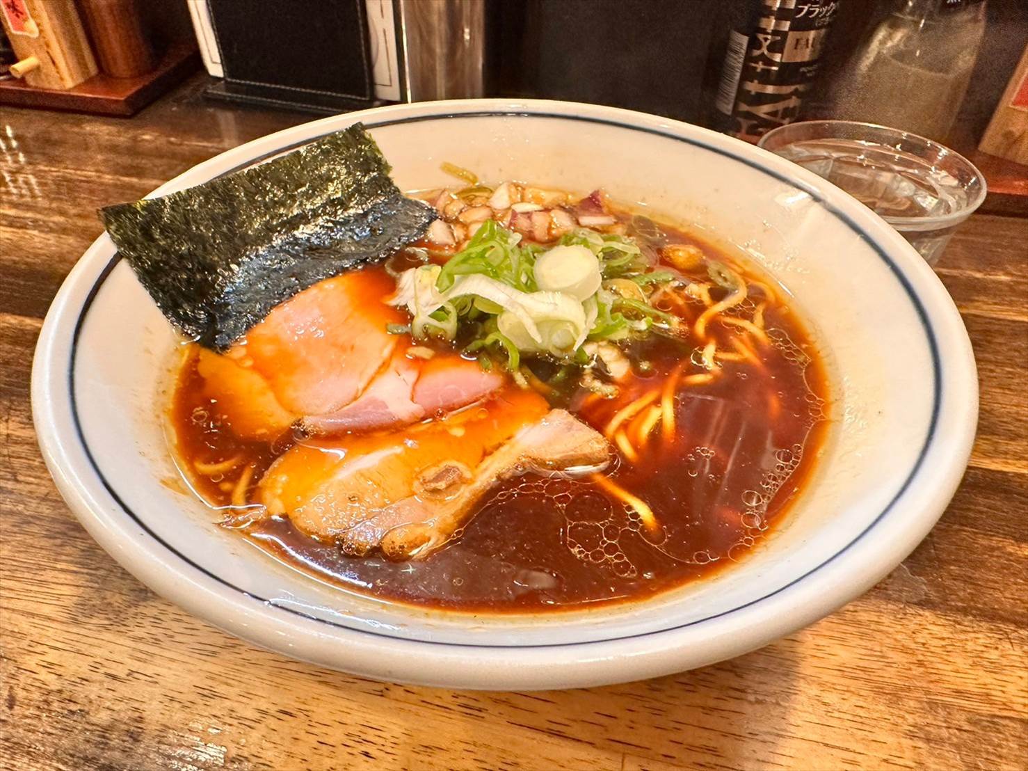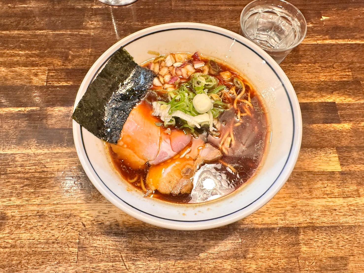 濃厚な醤油のスープに、美味しそうなチャーシュー・玉ねぎがぷかりと浮かんでいて、もう見た目だけでめちゃくちゃ美味しいです。