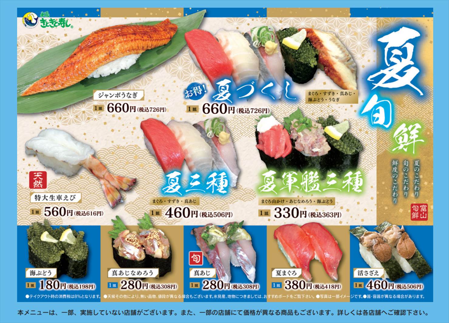 ▲きときと寿司のメニューは公式HP等では公開されていませんが、期間限定のメニューであればこんな感じで用意されていました。