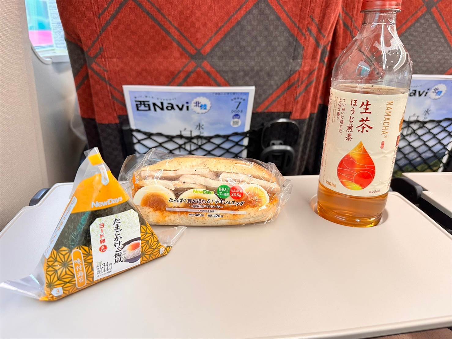 ▲今回の朝食はは東京駅内のNewDaysでそれぞれ好みのものを購入して、新幹線の中でゆっくりといただきました🍙