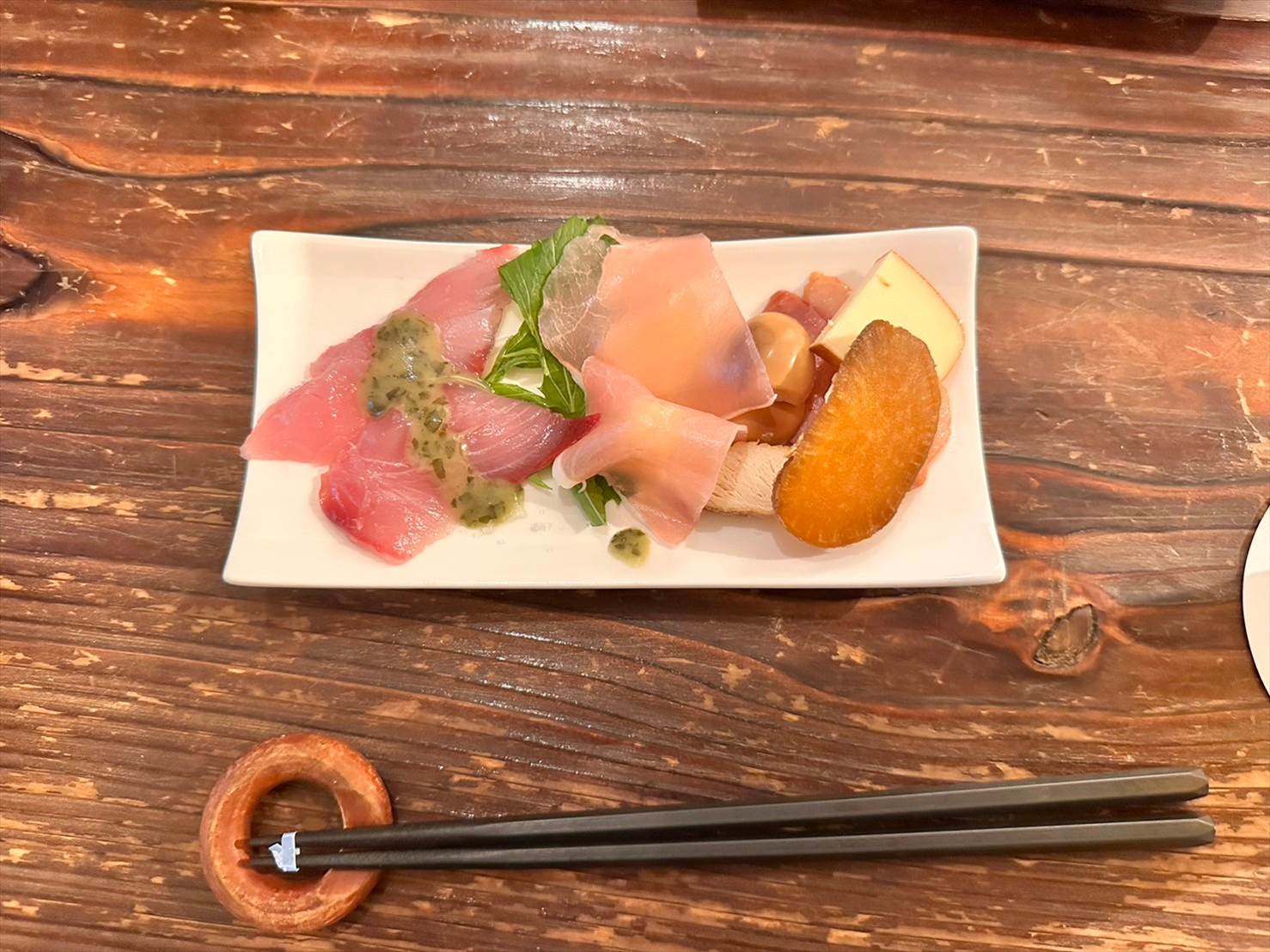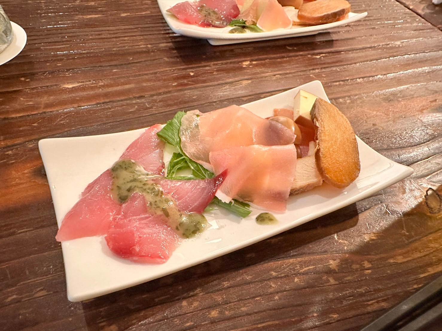 カルパッチョ、生ハムレモン、燻製盛り合わせがひとつのプレートに乗って提供されました。