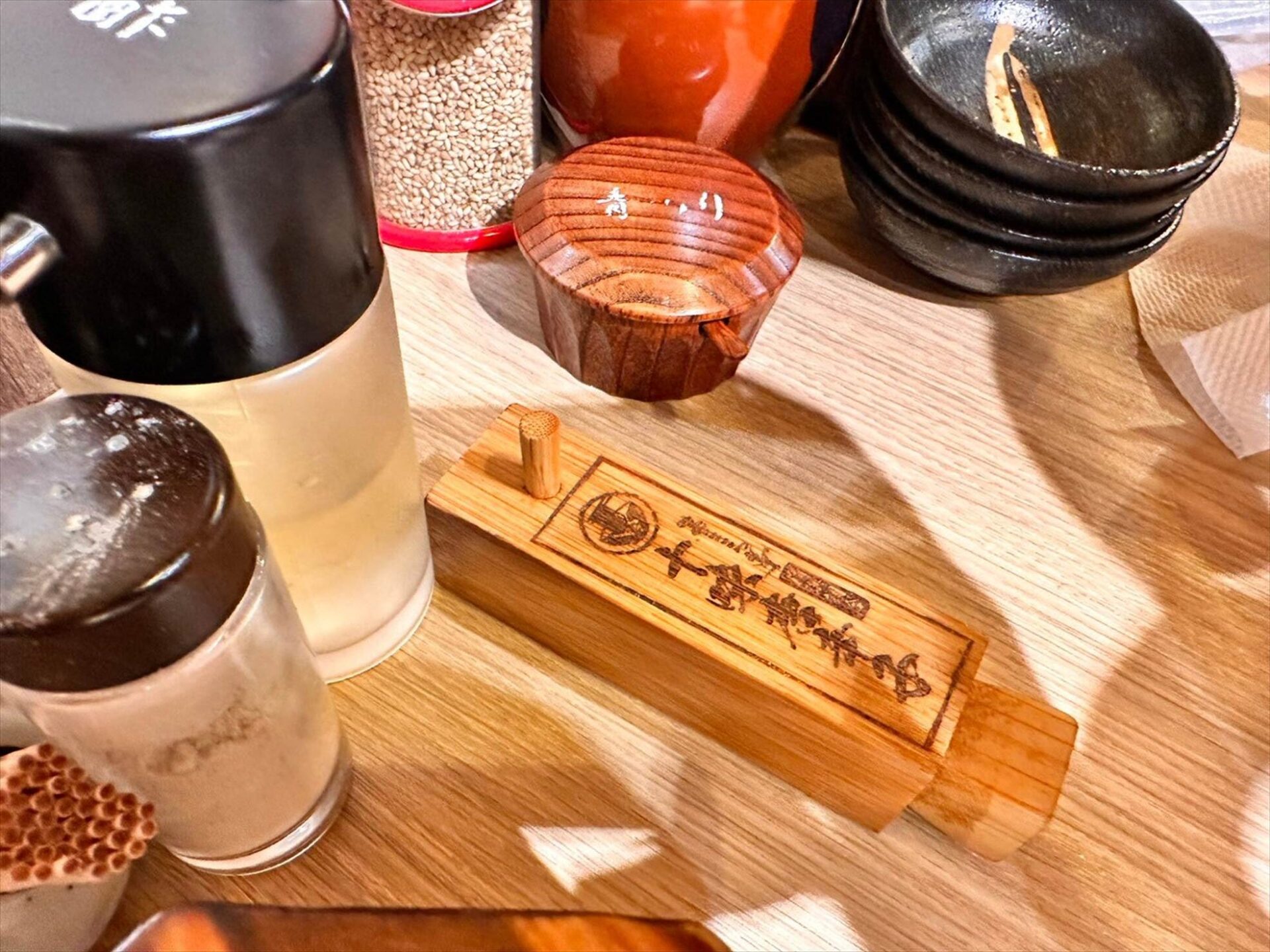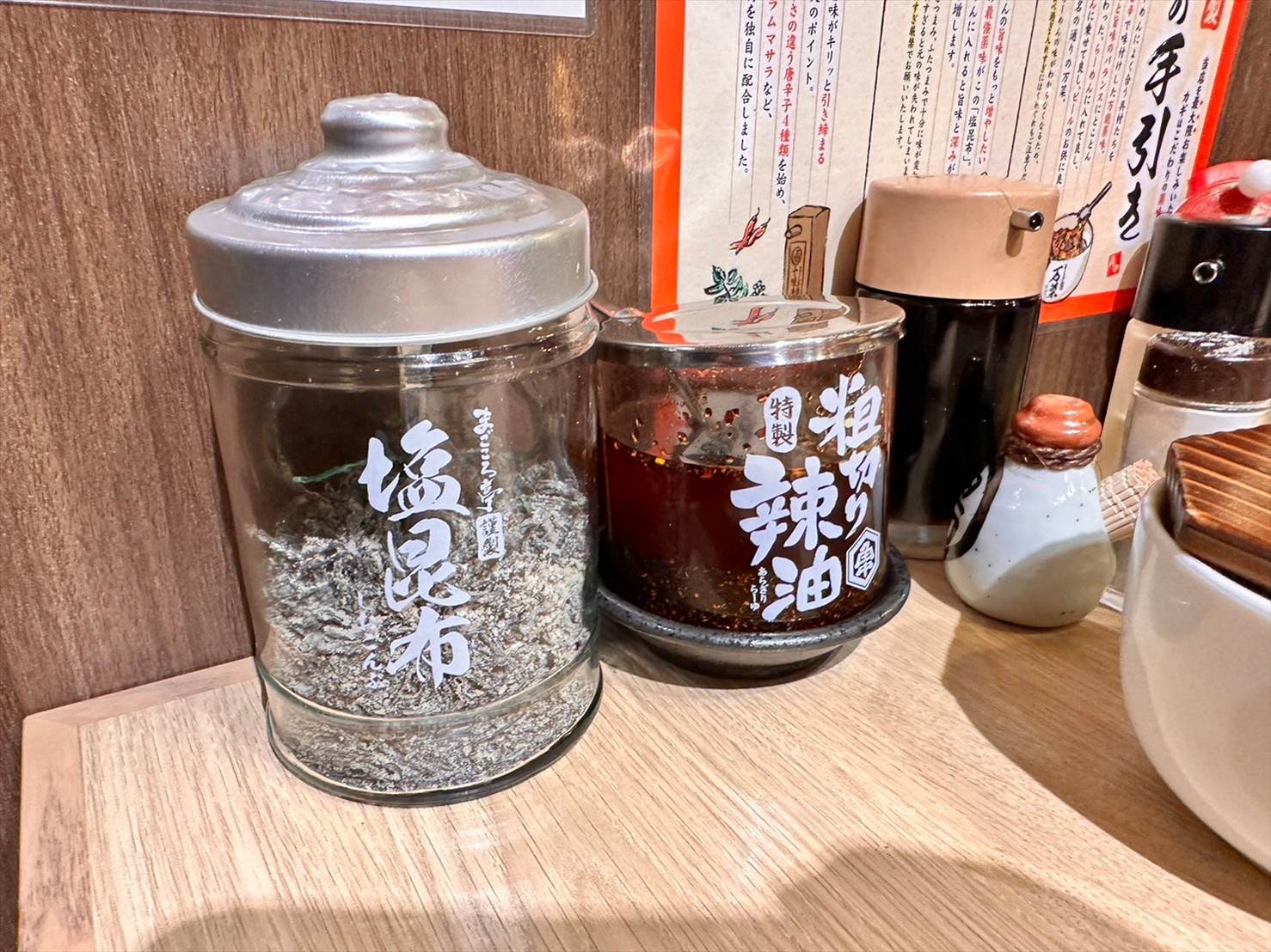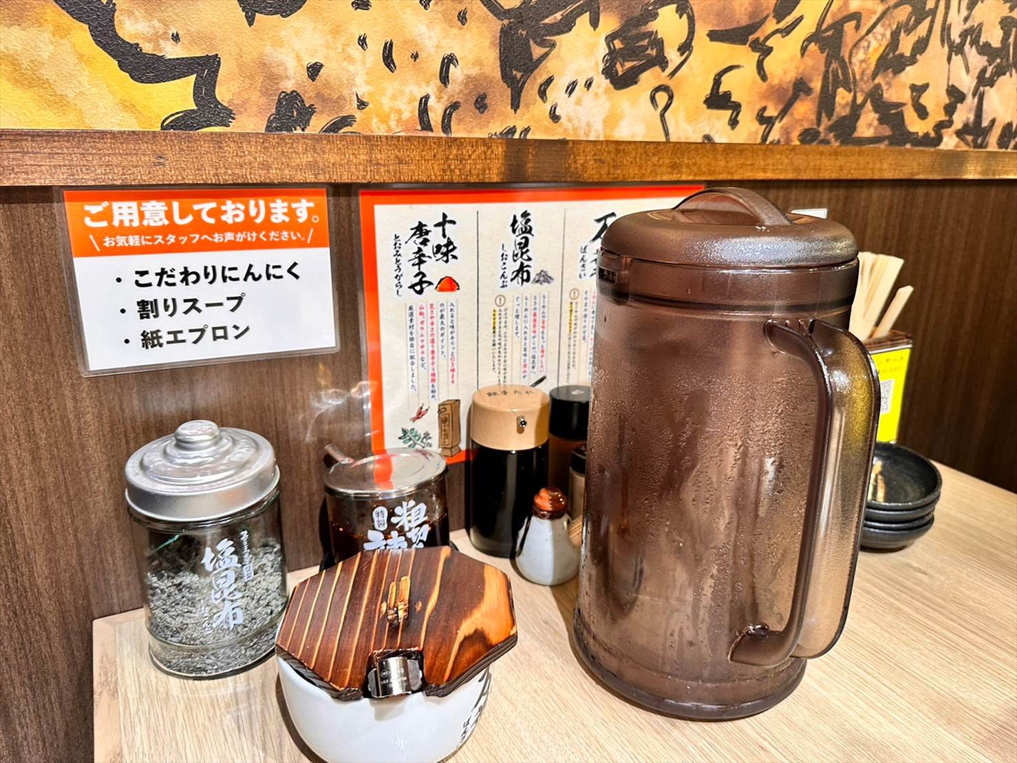 ▲テーブル席にはお水の他、ラーメン等にトッピングできる諸々が用意されていました。