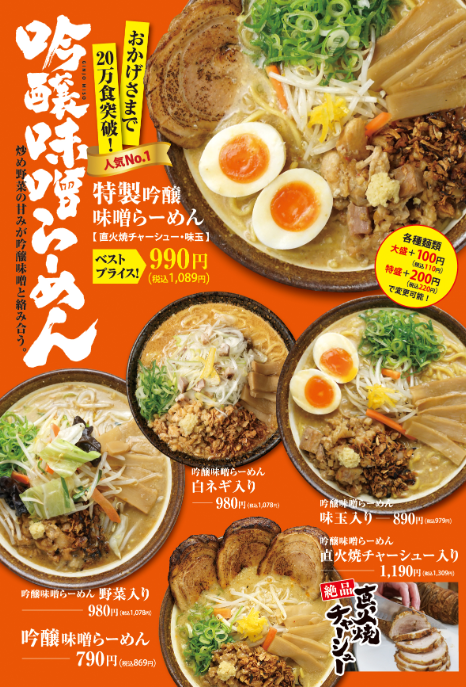 一番の看板メニューは「吟醸味噌らーめん」ですが、他にも魅力的なラインナップが並んでいますね~!