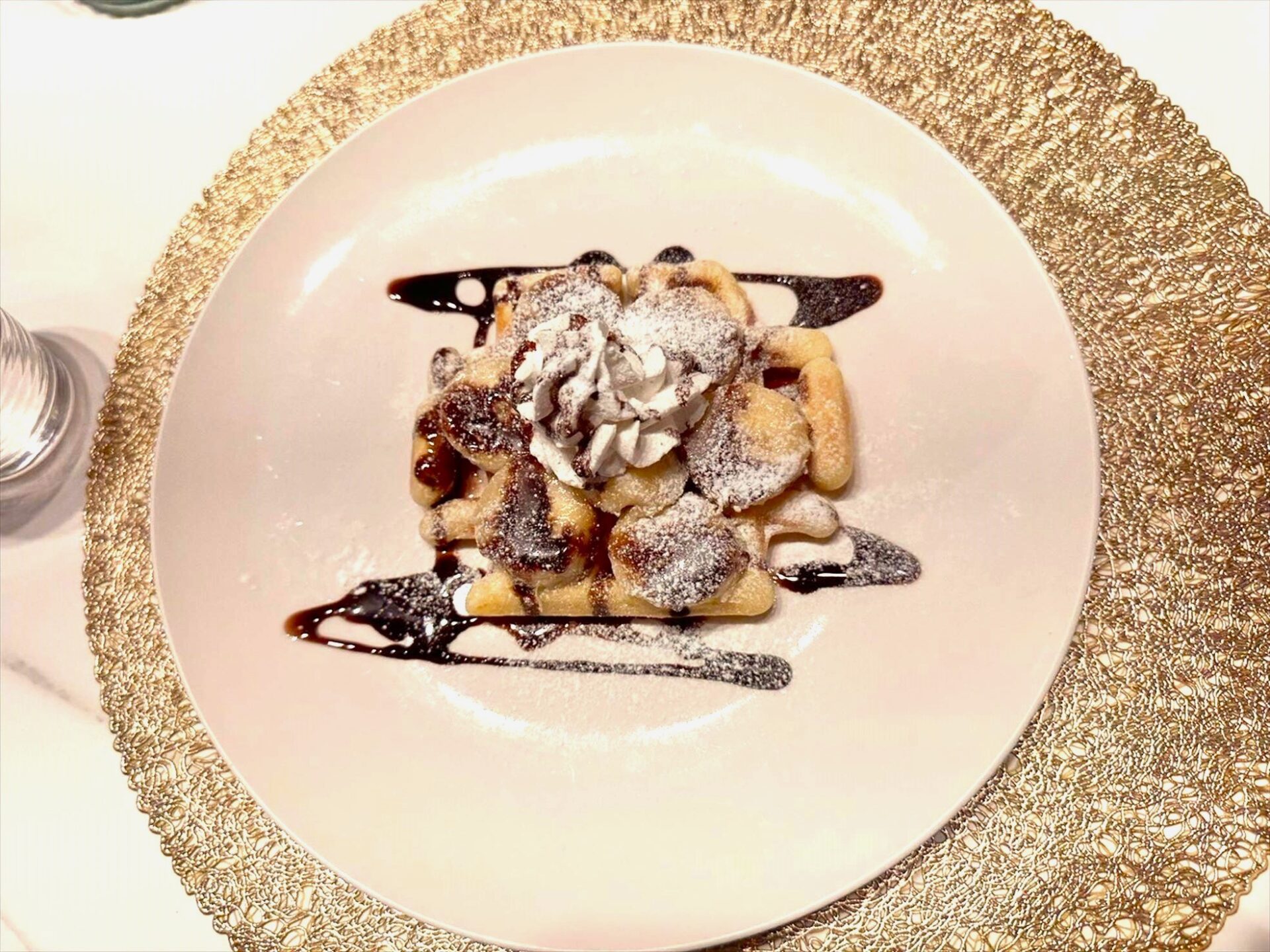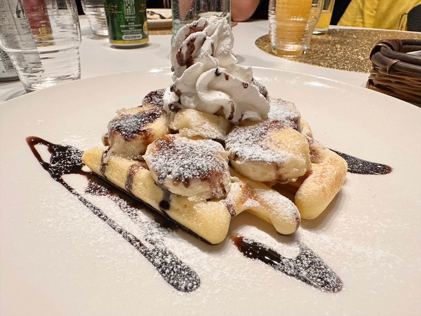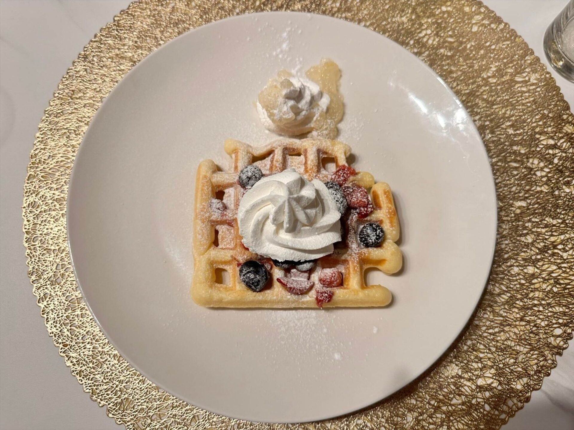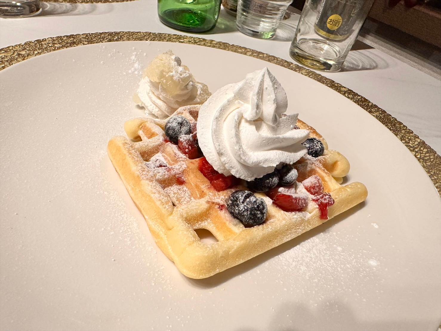 ▲〆は焼き立てのベルギーワッフル!お味はベリーフルーツとバナナチョコの二種類から選べ、私はベリーフルーツをチョイスしました。