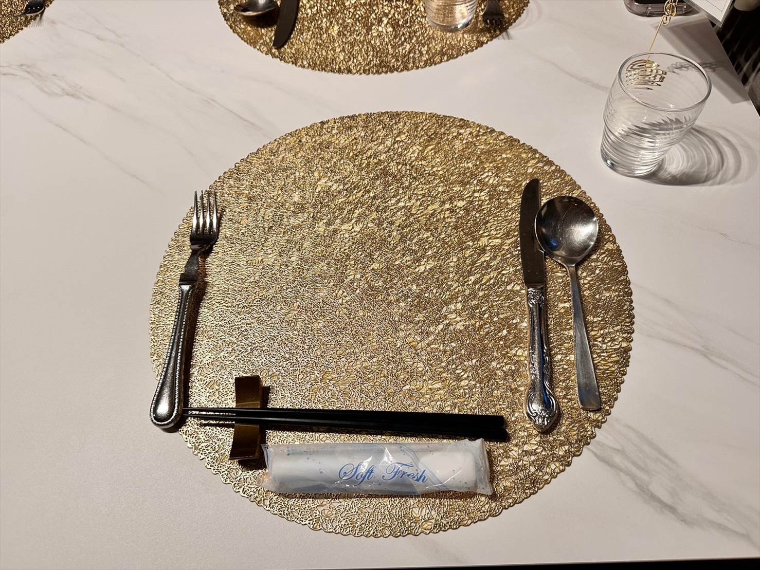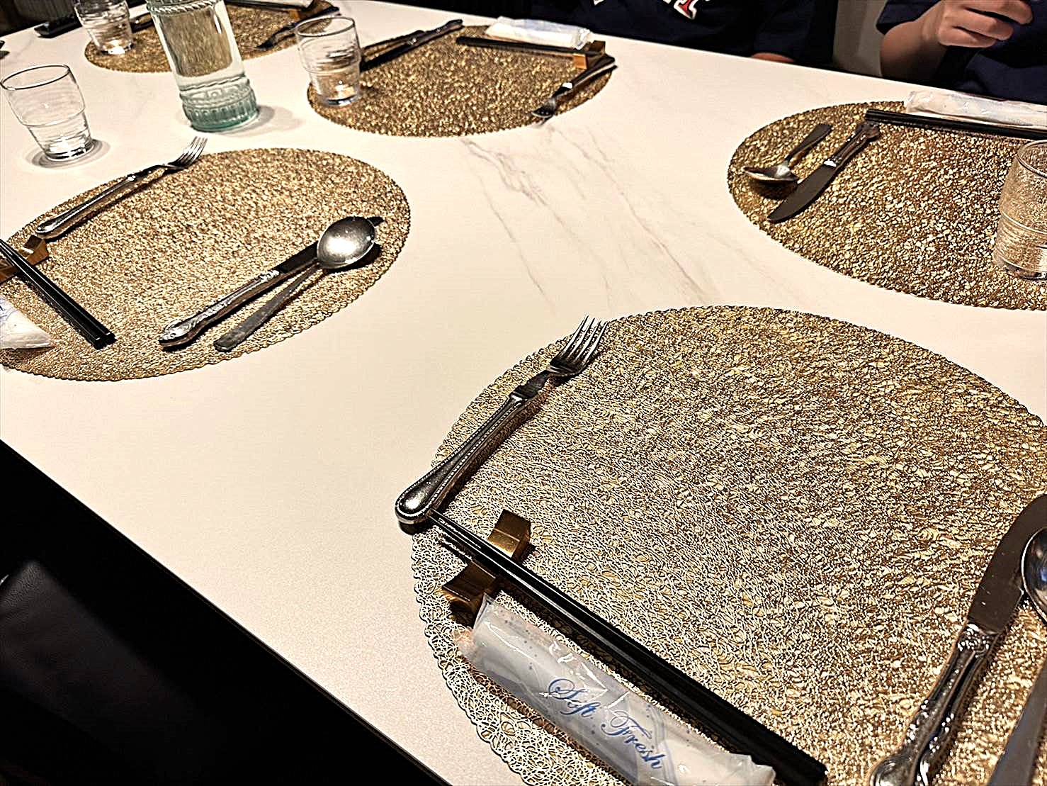 金色のマットにカトラリー等が用意され、ダイニングテーブルが一気におしゃれな雰囲気に仕上がります。