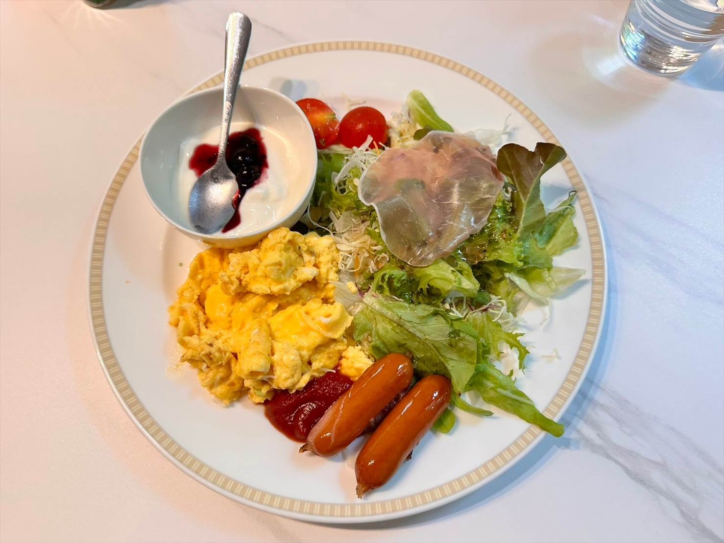 サラダに生ハム、スクランブルエッグにソーセージ、ヨーグルト。とっても豪華だ…。