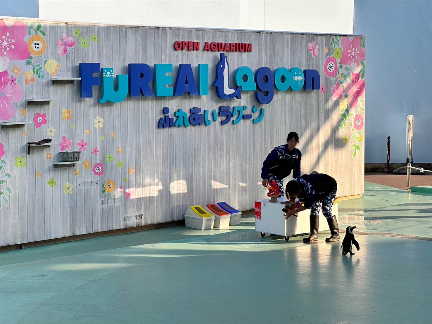 「FUREAI LAGOON」の看板をよく見てみると、アシカやイルカが隠れているのが可愛いですね。