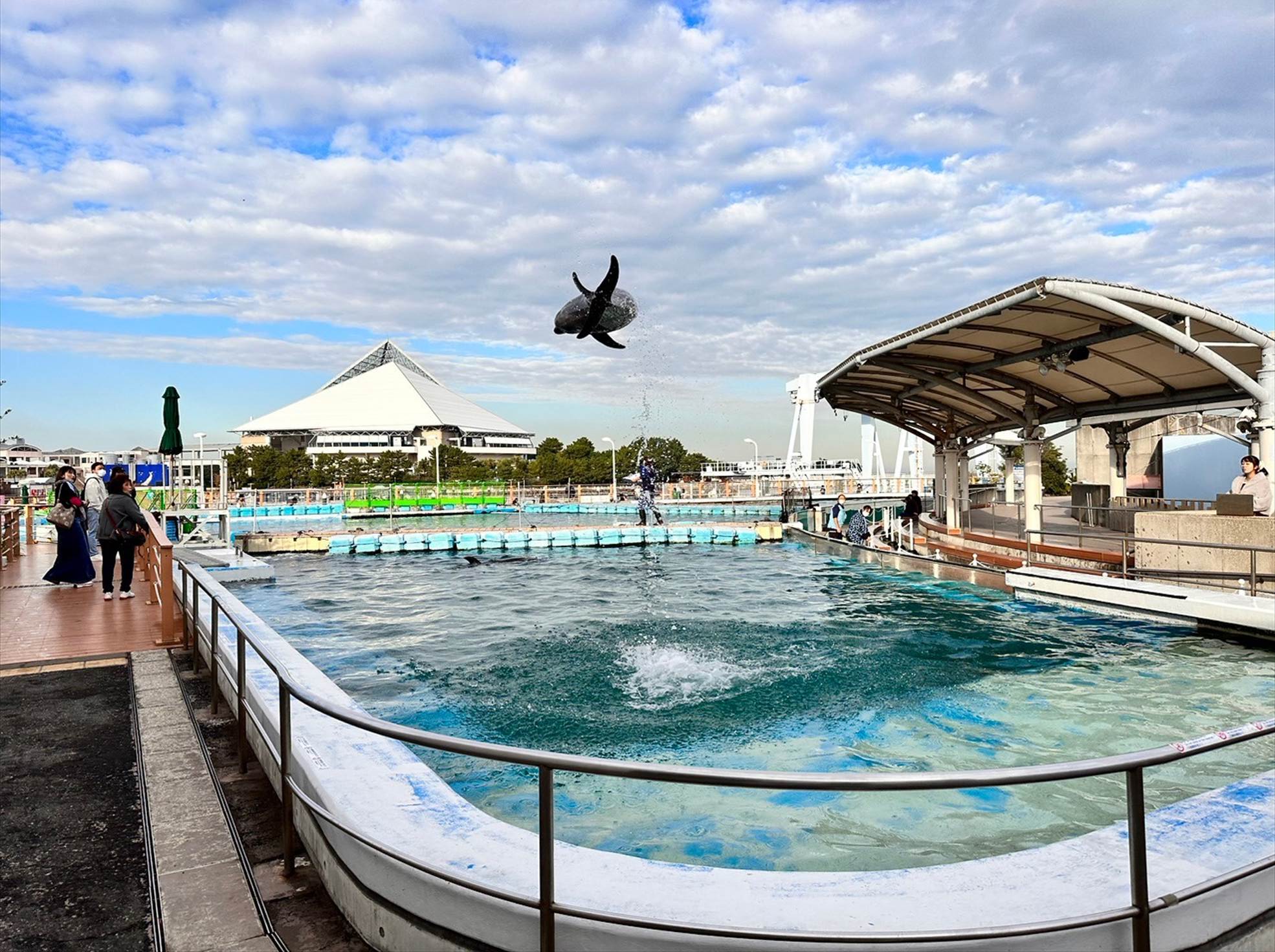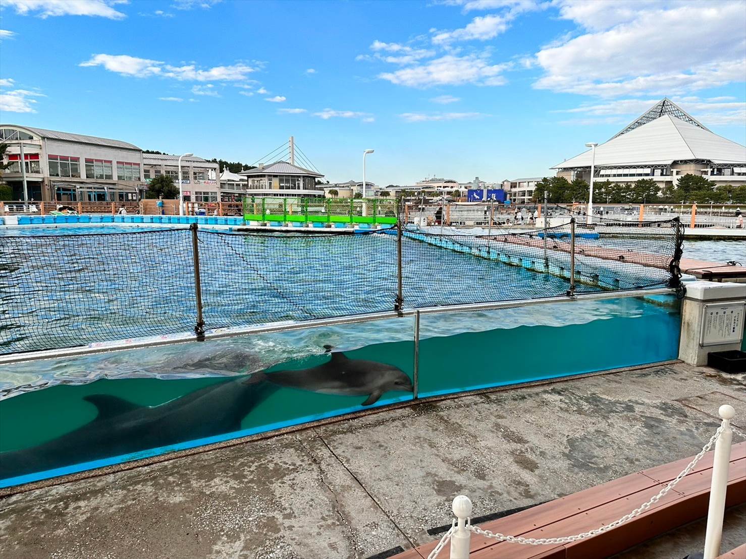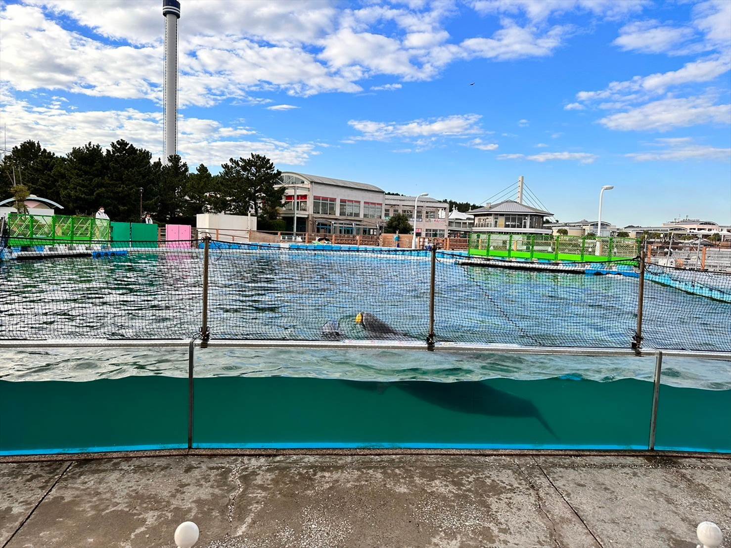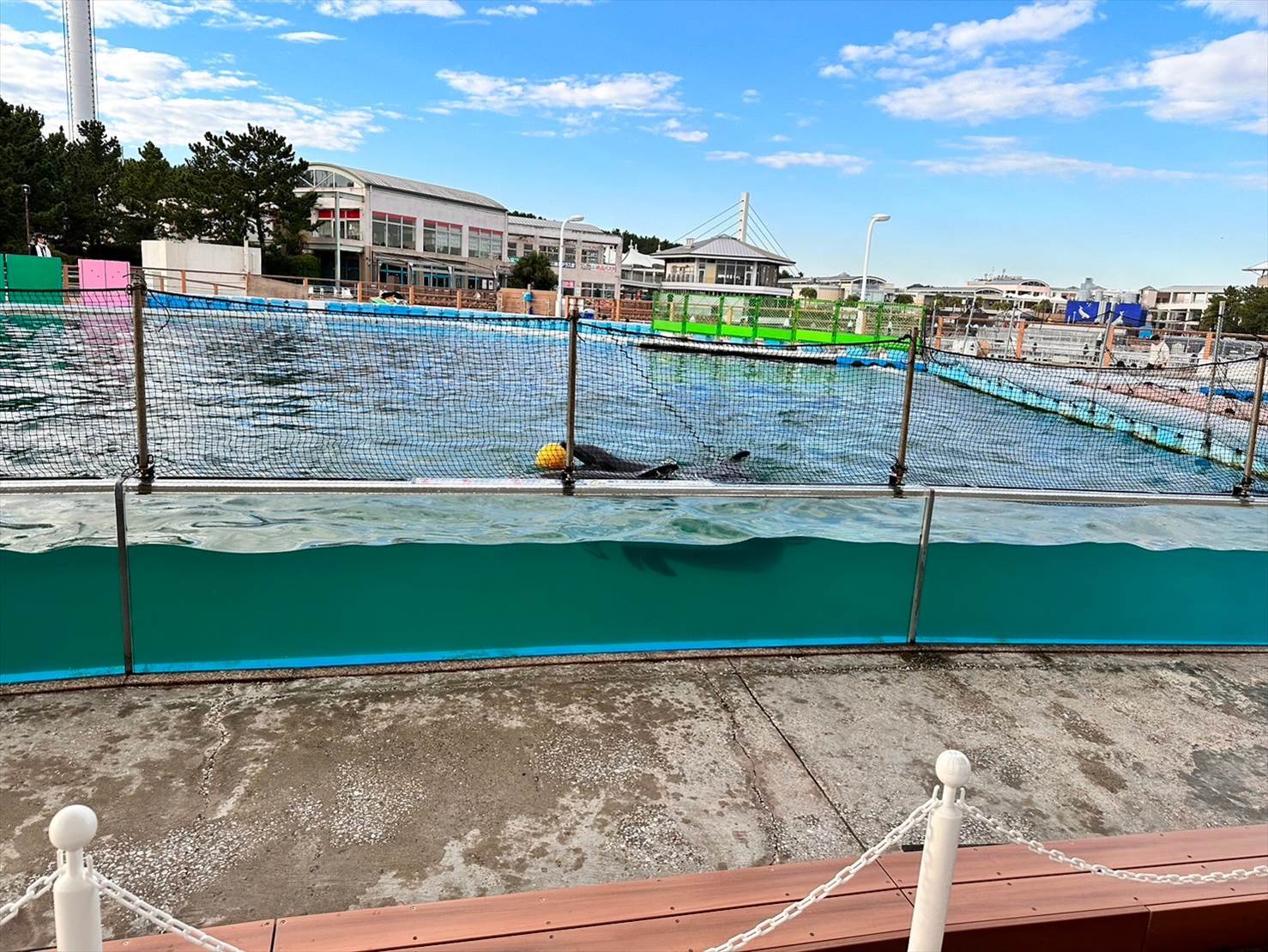 ▲この頃にはこちら側は綺麗な快晴に。青い空の下、イルカプールが映えますね…!