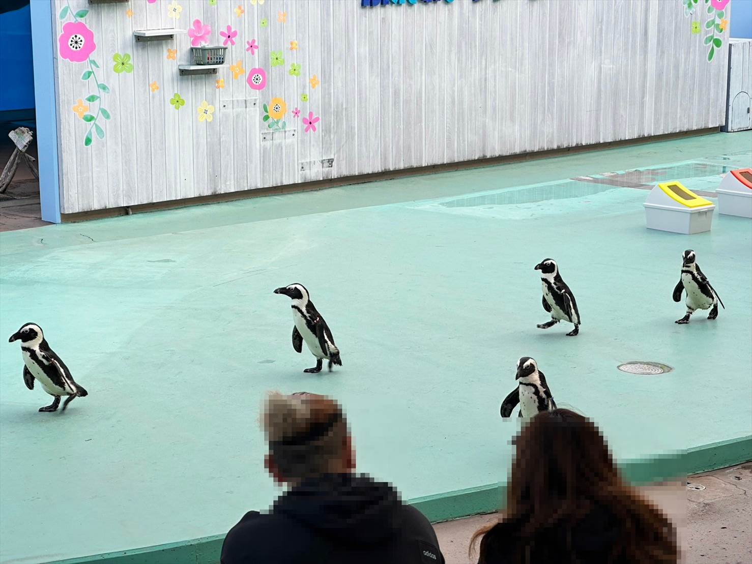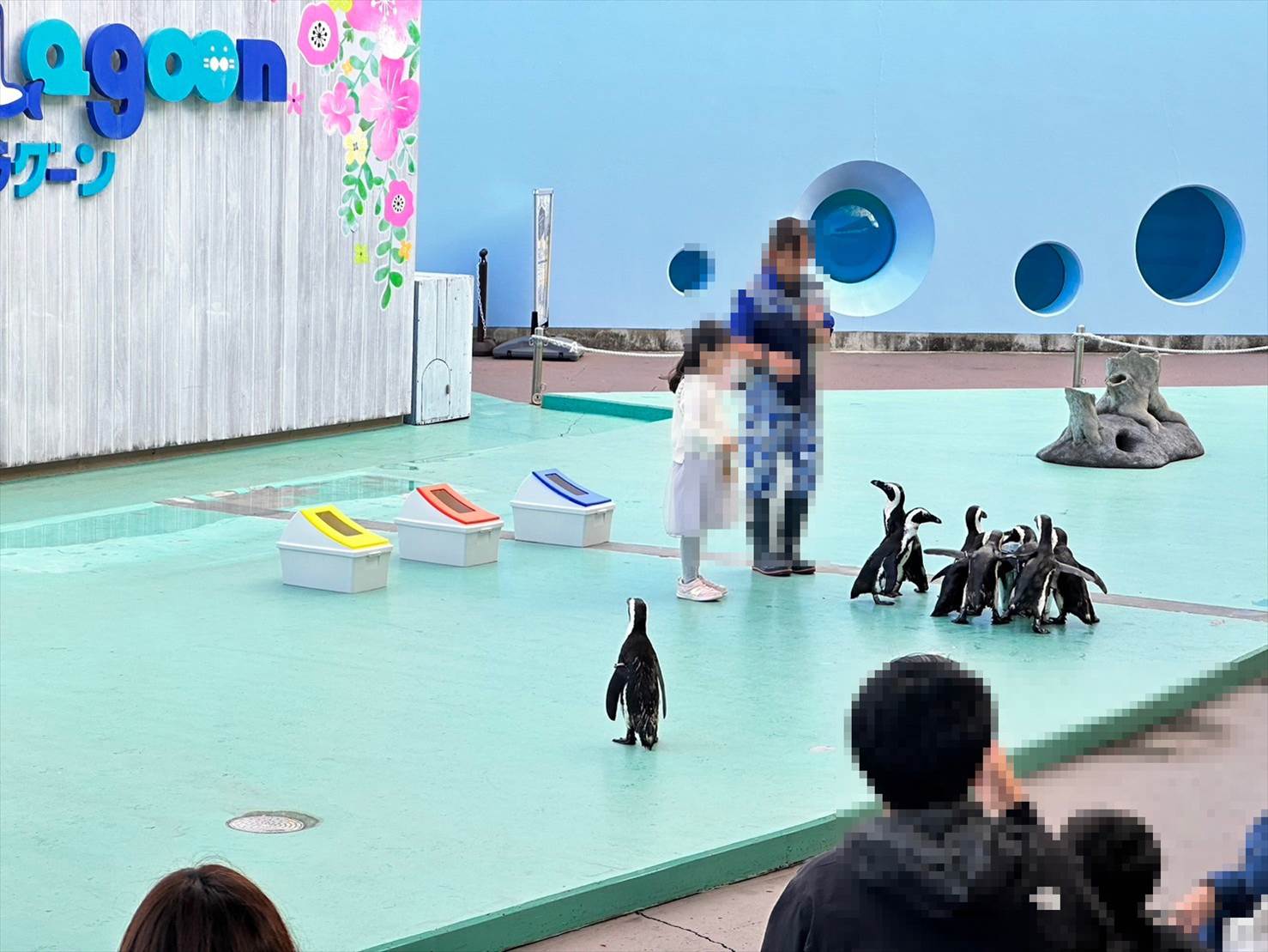 ただ、ペンギンにも色んな子がいるようで、アジのことしか目に入らず一目散に食べまくる子、ベルを鳴らした女の子が気になる子、更には超マイペースに客席近くを歩き回る子など…。