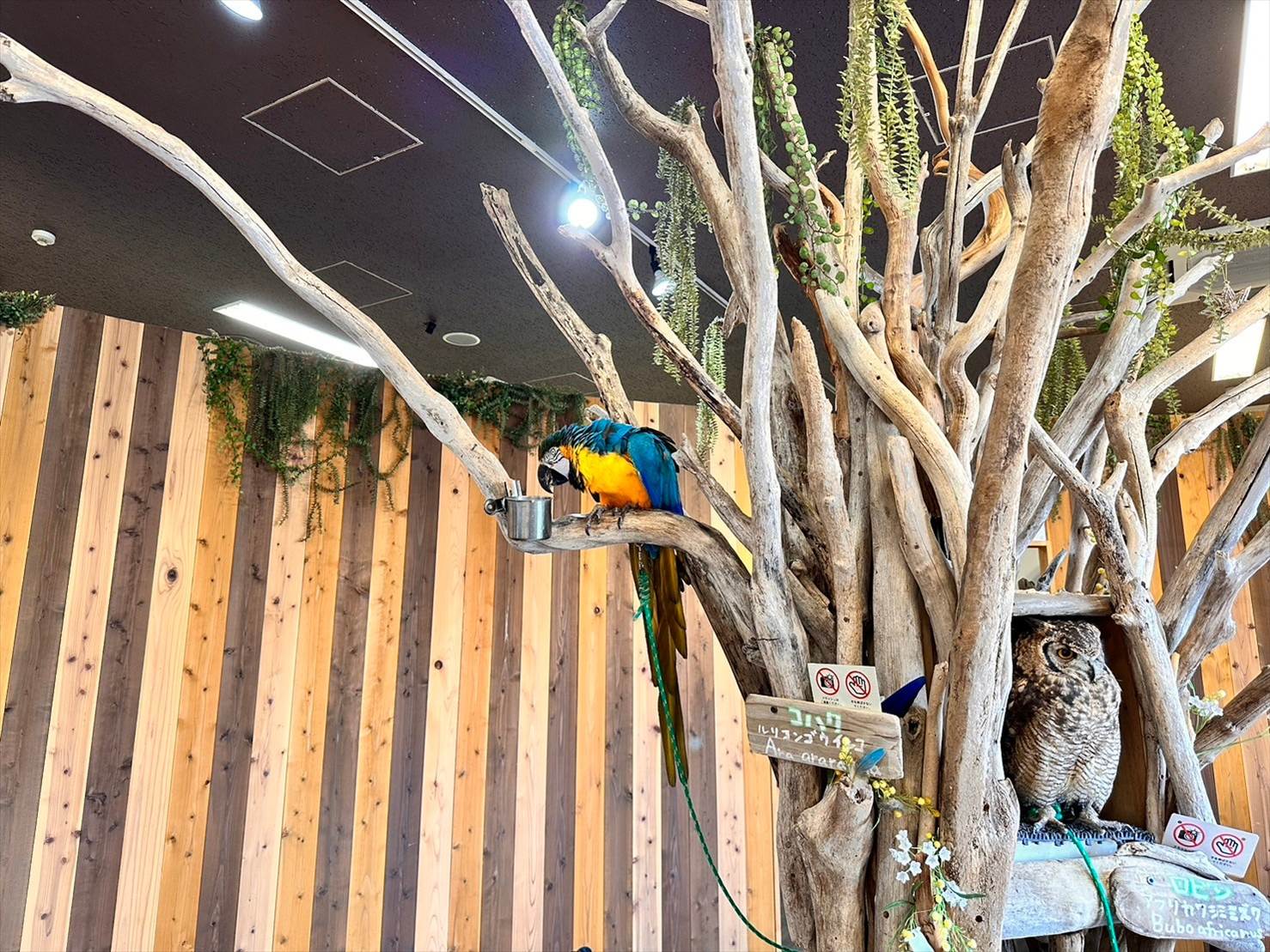 ▲オウムのコハクと、アフリカワシミミズクのロビンがお出迎えしてくれました~!