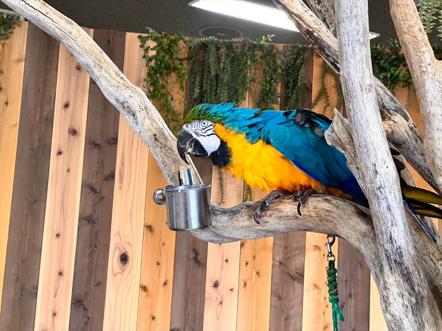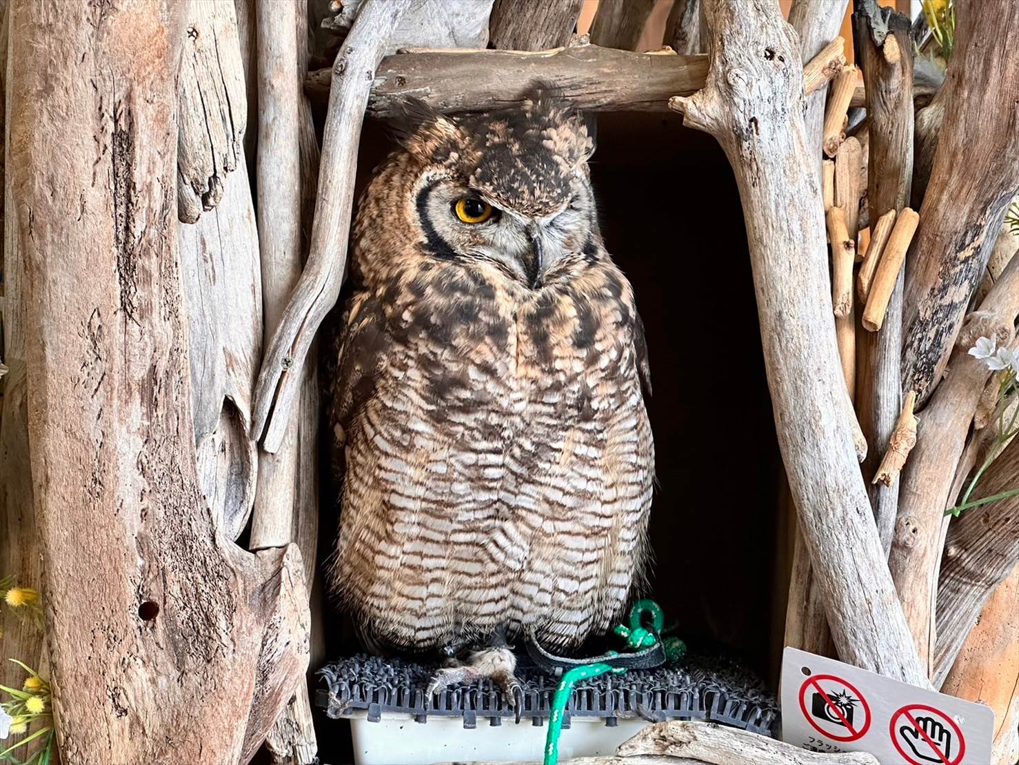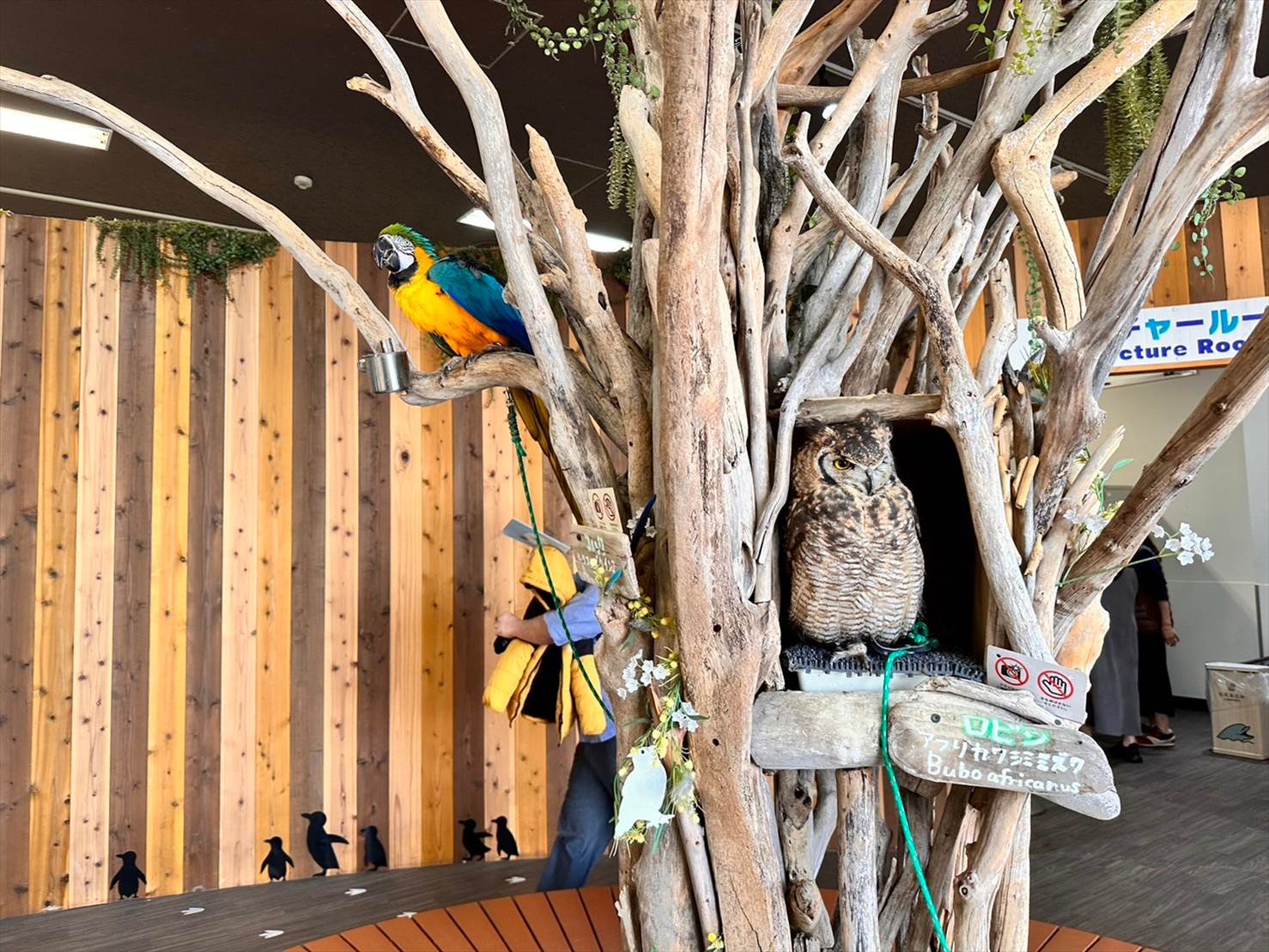ふれあいプログラムの受付や、コインロッカーの用意があるエリアですが、真ん中の止まり木をよく見てみると…