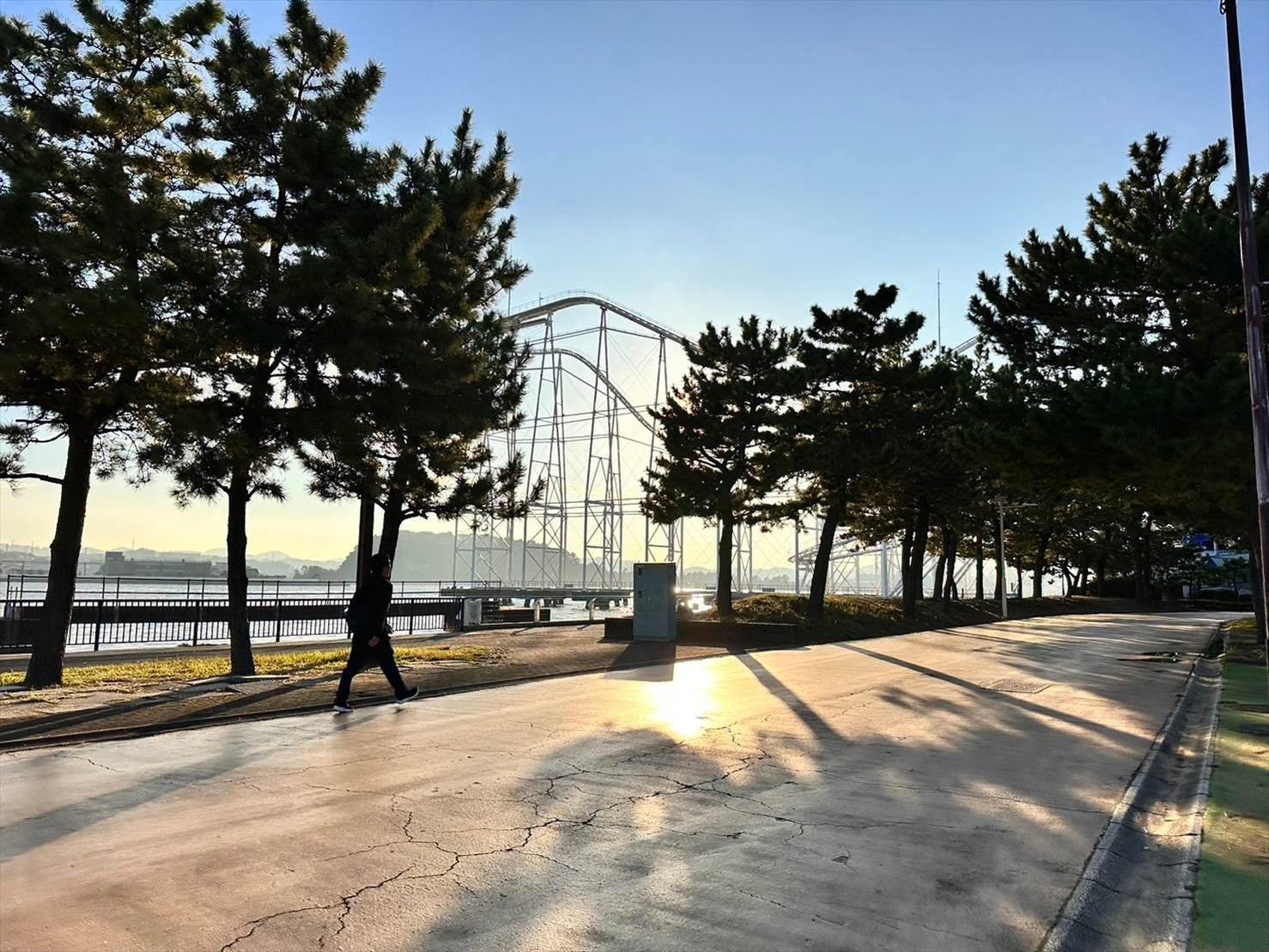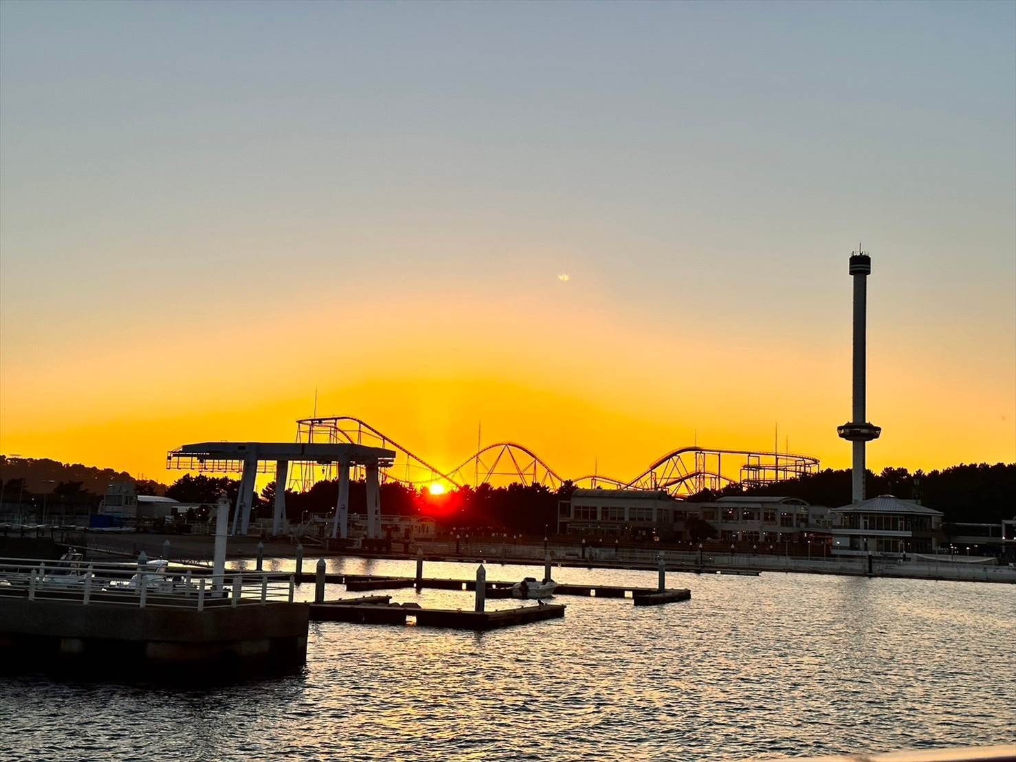 ▲先ほど乗車したばかりのジェットコースターの方向に、太陽が沈んでいくのが見えます…!
