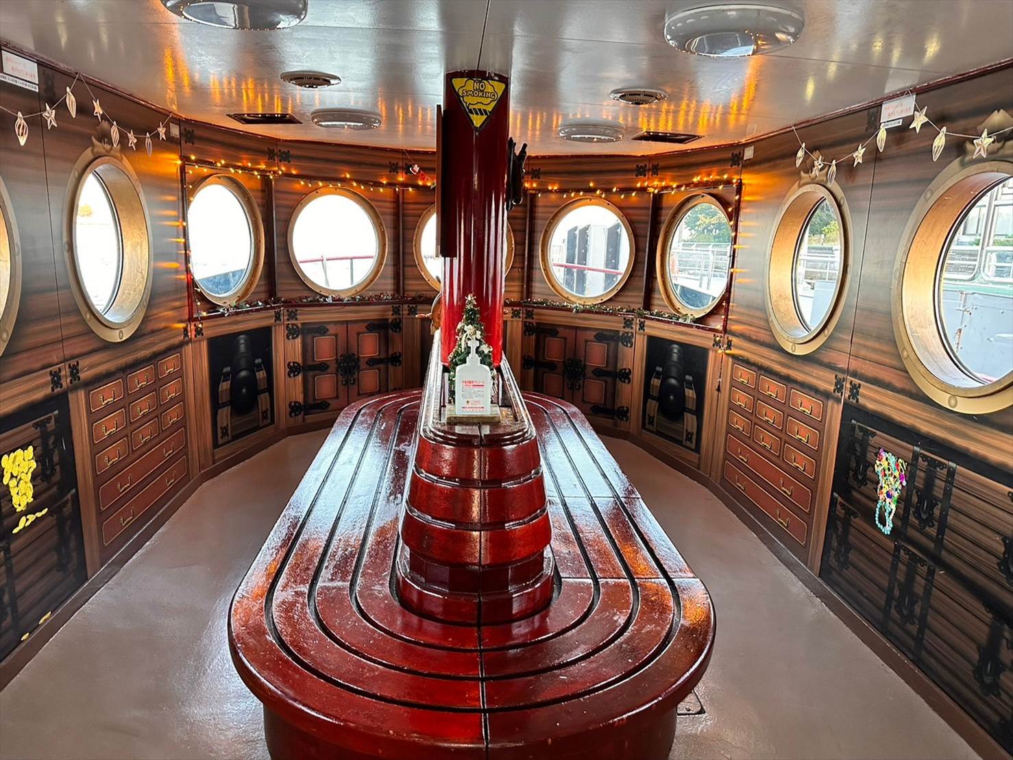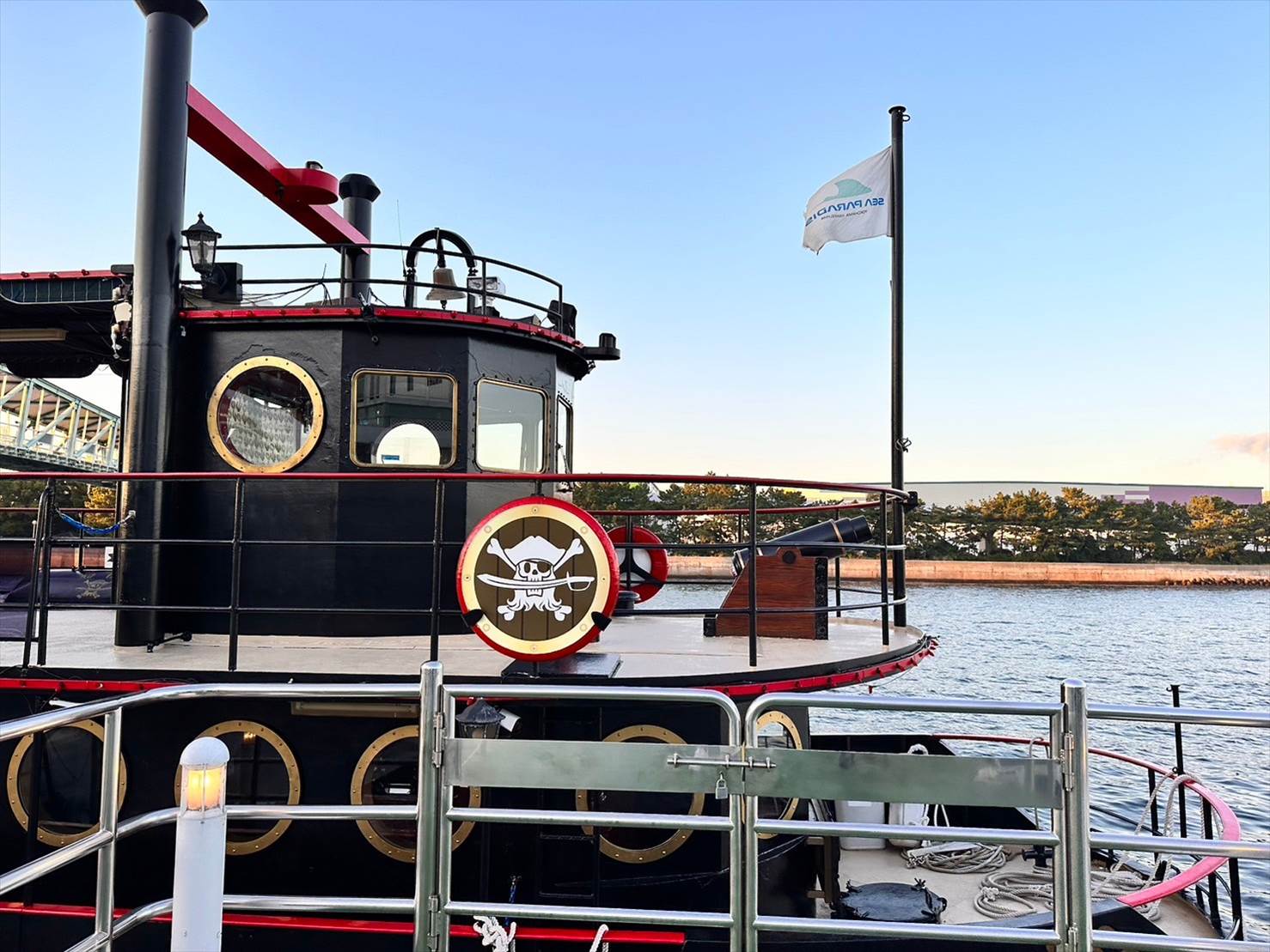 丸い窓と周囲に描かれたイラストが海賊船らしい雰囲気を醸し出していて、良い感じ…!
