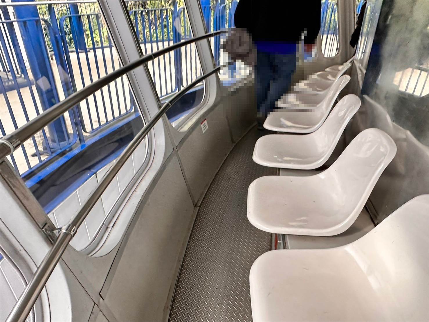 中に乗り込むと、こんなふうにベンチがぐるっと外側に向かって用意されており、好きな場所に座る形。