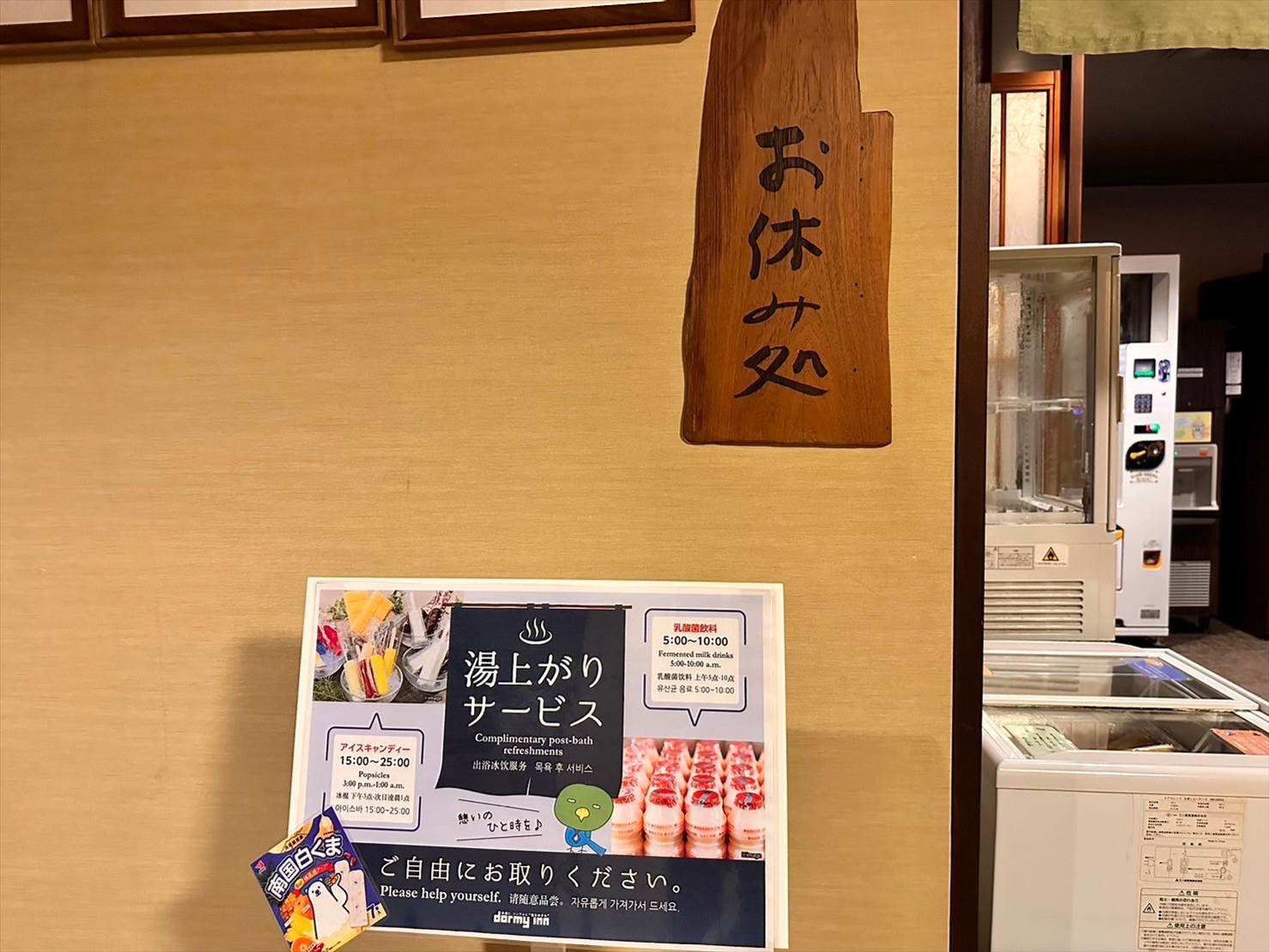 - 夜鳴きそば・湯上がりアイス・乳酸菌飲料の無料サービスが嬉しい