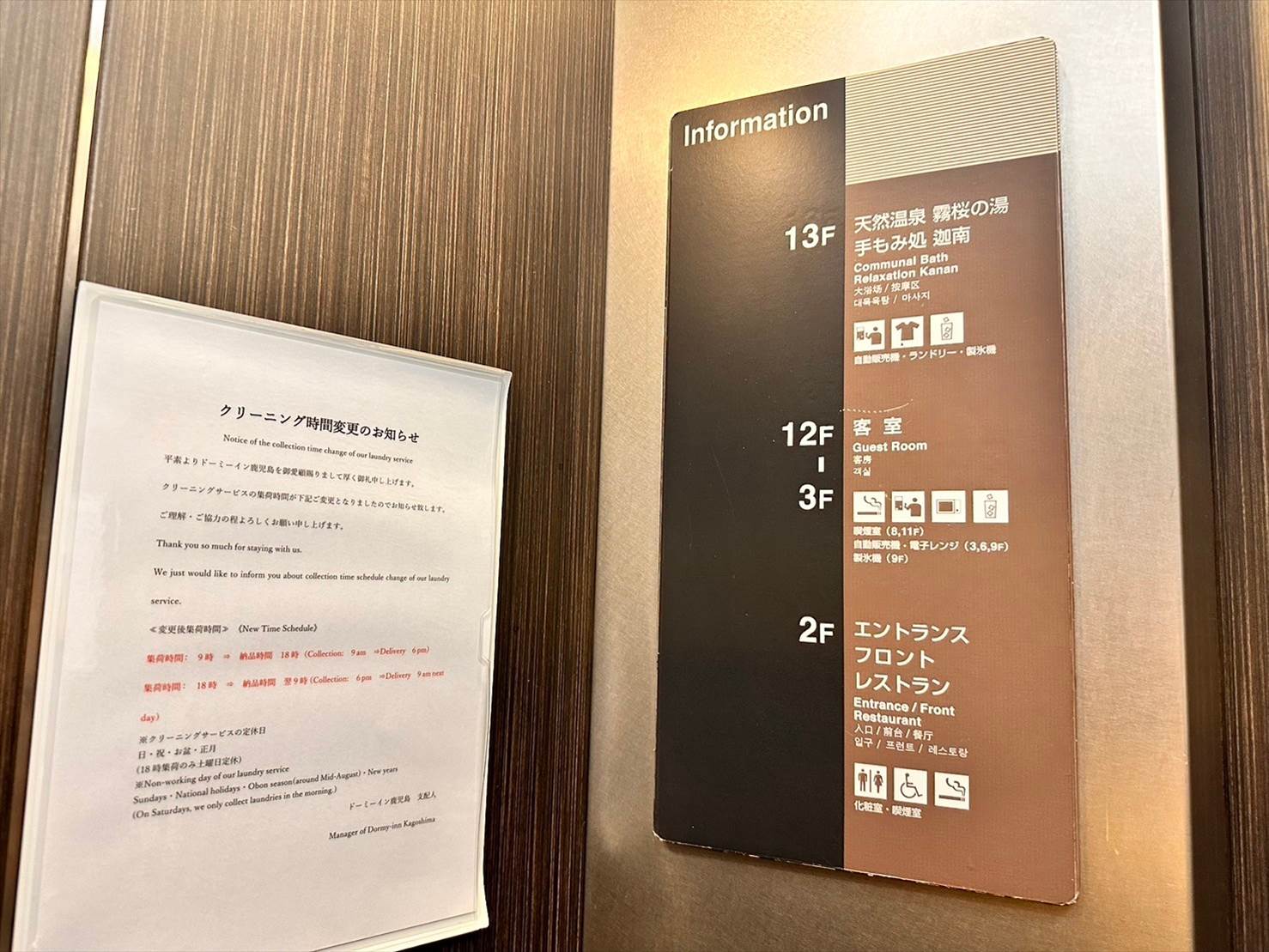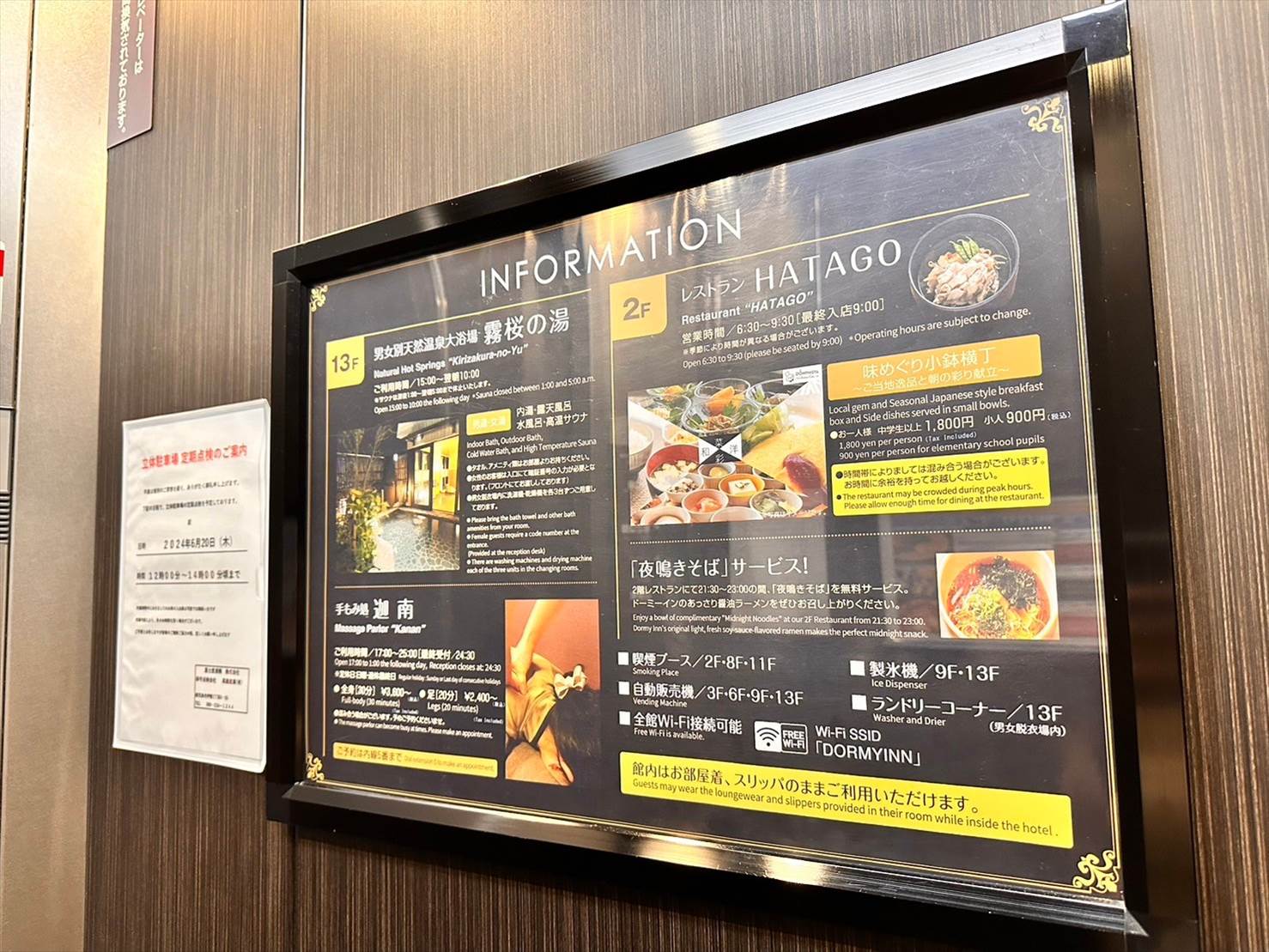 ▲エレベータの中に大浴場等の案内が用意されていました。