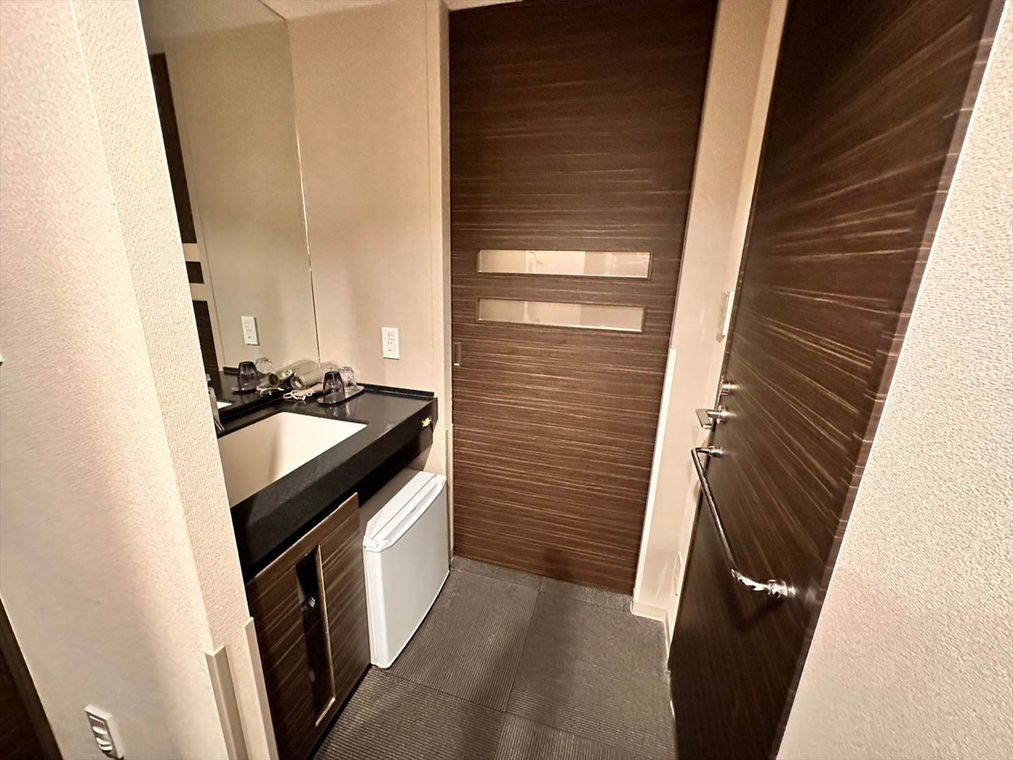 入ってすぐは洗面スペースになっており、ベッドエリアへ行くには1枚扉が用意されている状態でした。