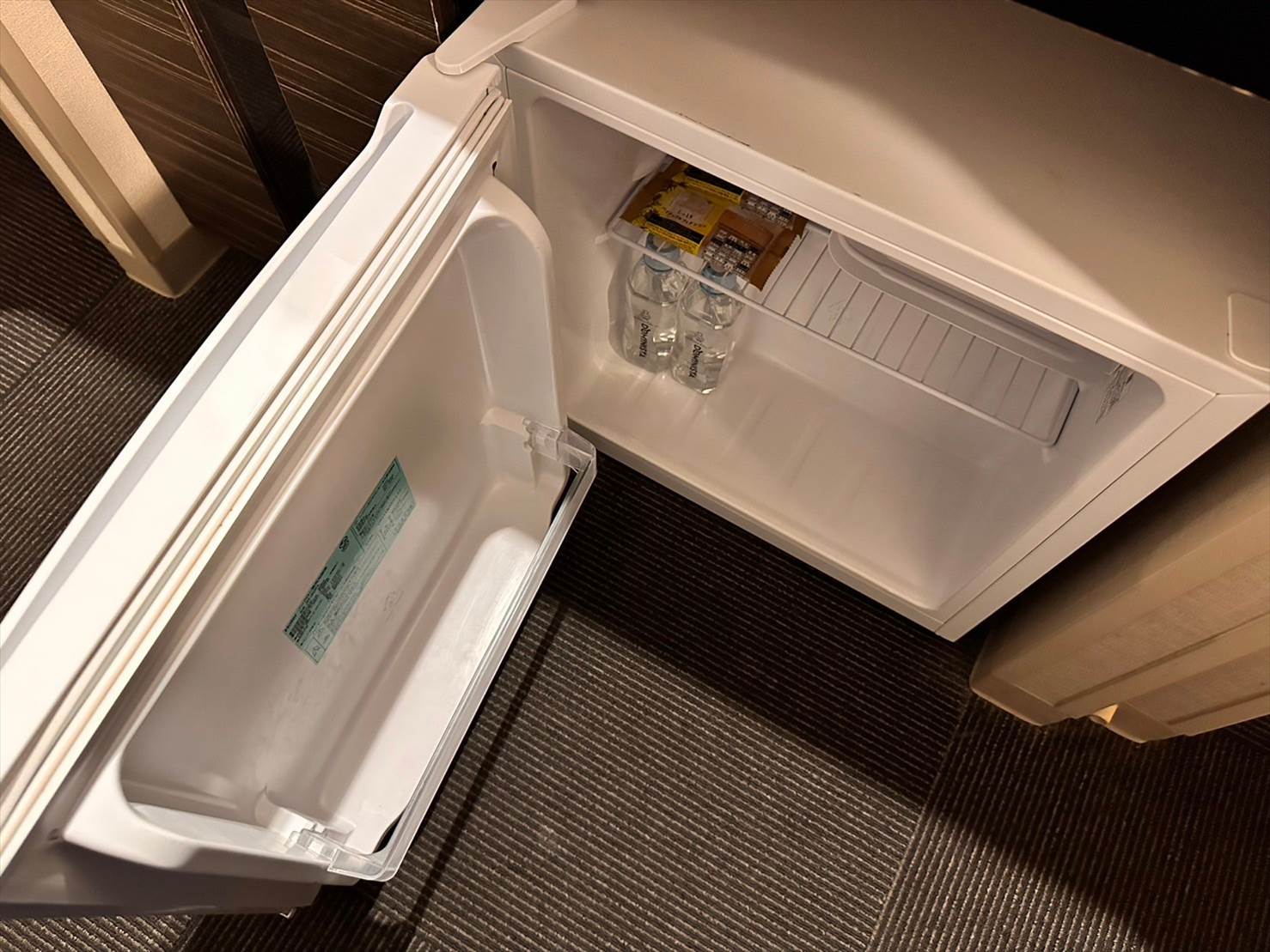 ▲次に客室備品について。冷蔵庫は扉の中にも格納できるタイプ。