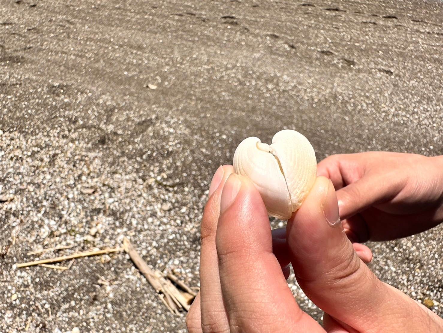 ▲知林ヶ島ではこんなふうに、2つ合わせるとハートのように見える貝がらが拾えるとの説明を受け、探してみたら見つけました!❤