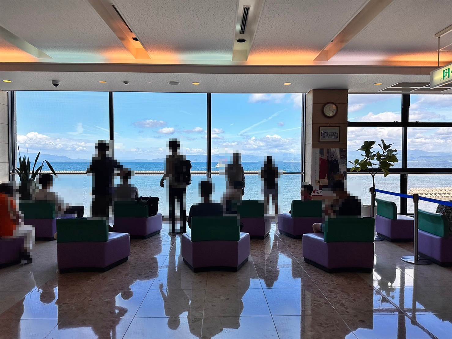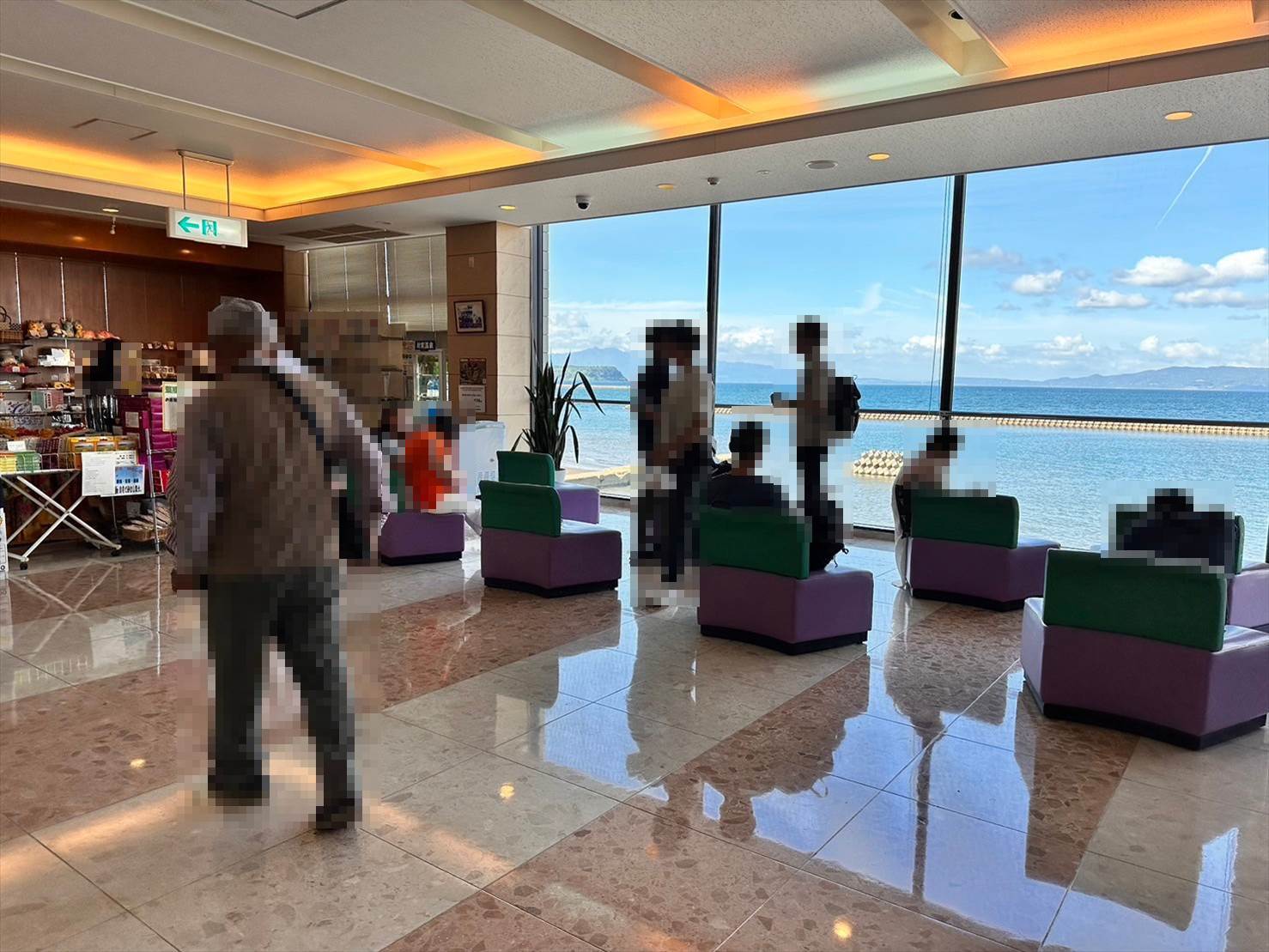 会館内にはこんなふうに、海に面した向きにソファーが沢山用意されており…