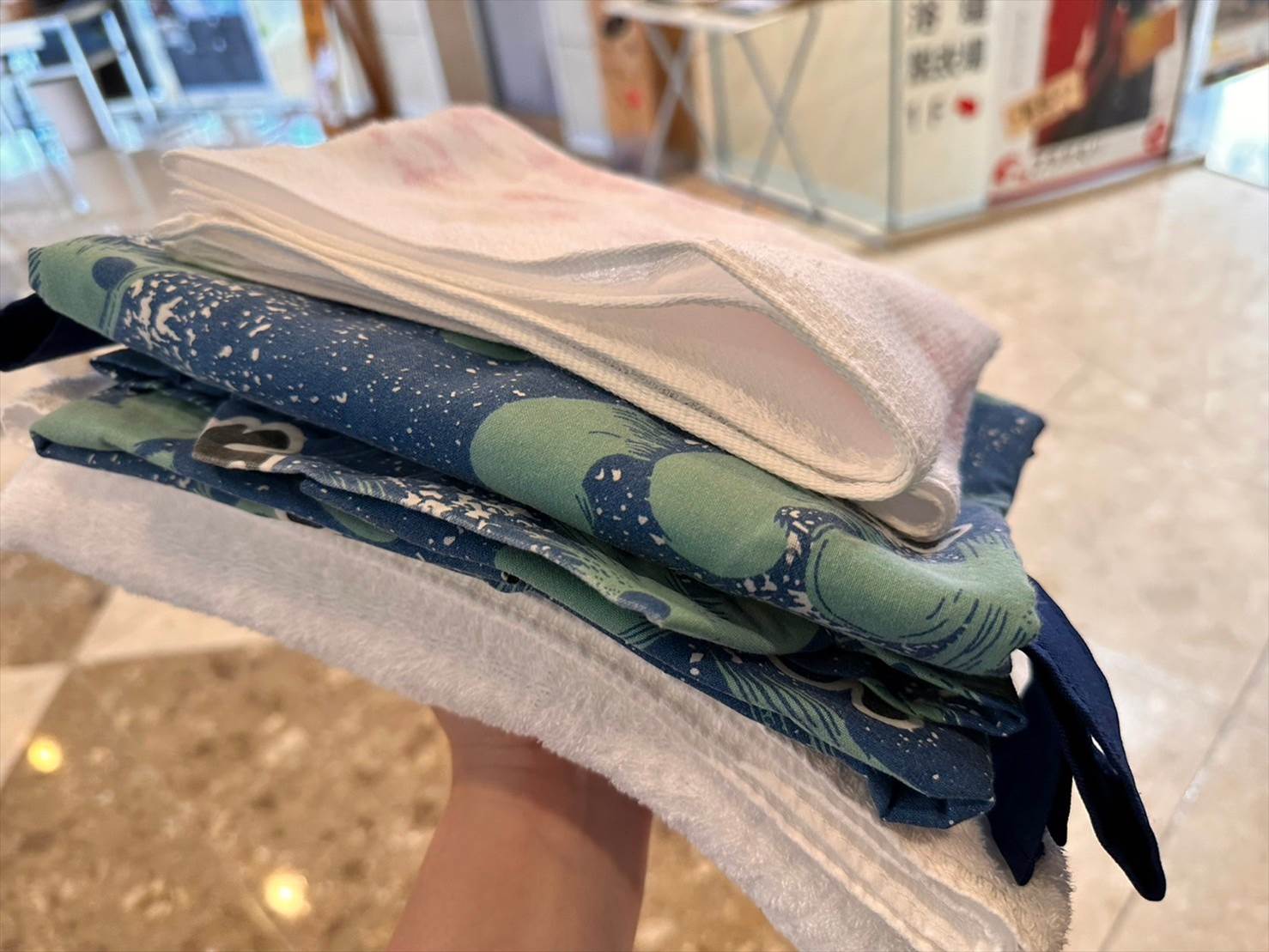 ▲砂楽オリジナルタオル、バスタオル、浴衣を受け取ります。
