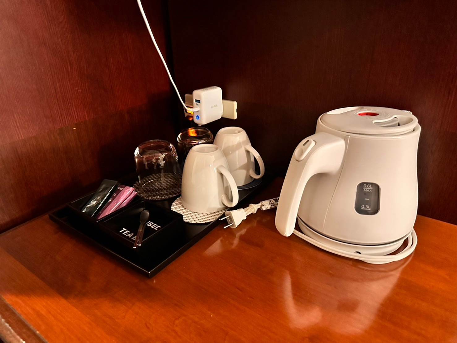 ▲ドリンク系の備品はこちら。マグカップ・グラスに電気ケトルが用意されています。