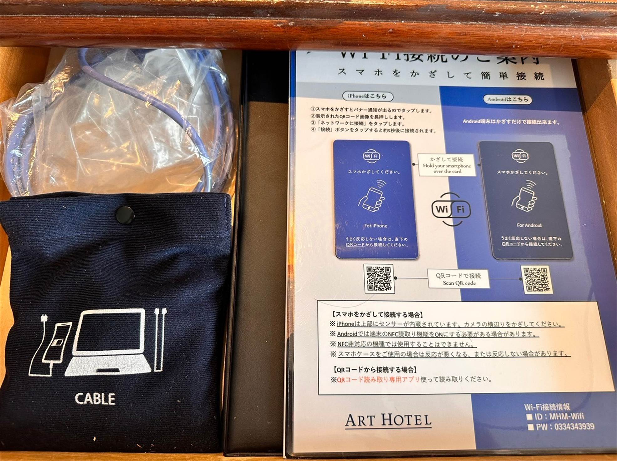 お部屋のWifiはNFCタグを用いてかざすだけでつなげる仕組み。地味にパスワードを入力するのは面倒なのでこれは良いなと思います。