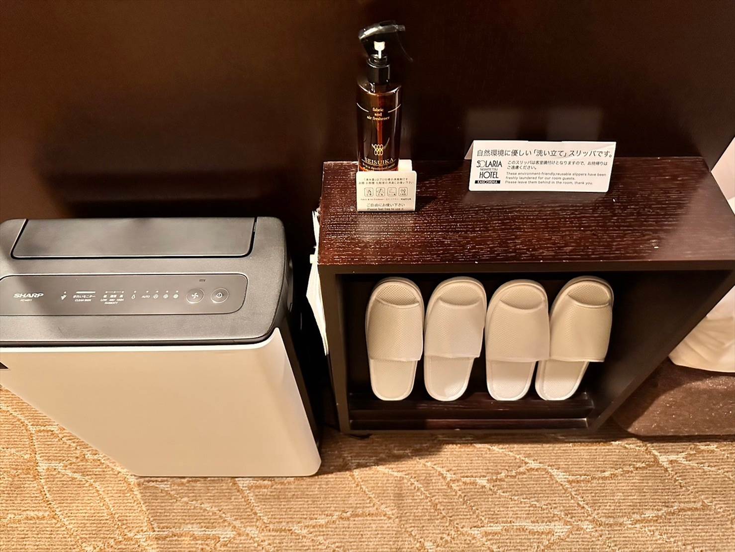 ▲廊下スペースにスリッパ・消臭スプレー・空気清浄機が用意されています。