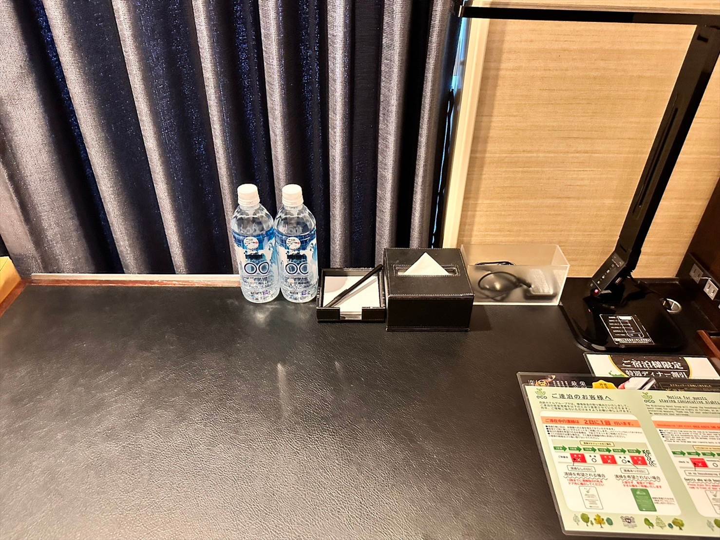 ▲デスクの上にはティッシュ、メモ帳とペン、お水の用意が。