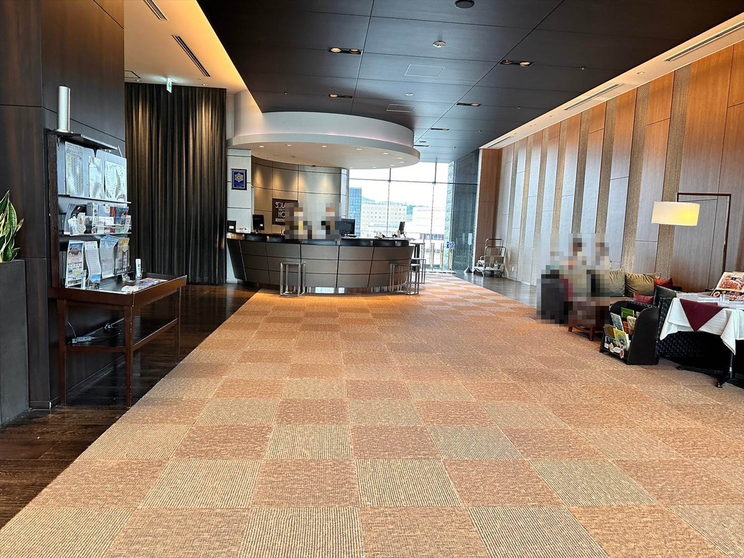 ▲ホテルのフロントの様子はこちら。奥の窓からは反対に鹿児島中央駅が見え、ホテルとしての眺望の良さを早くも存分に感じます。