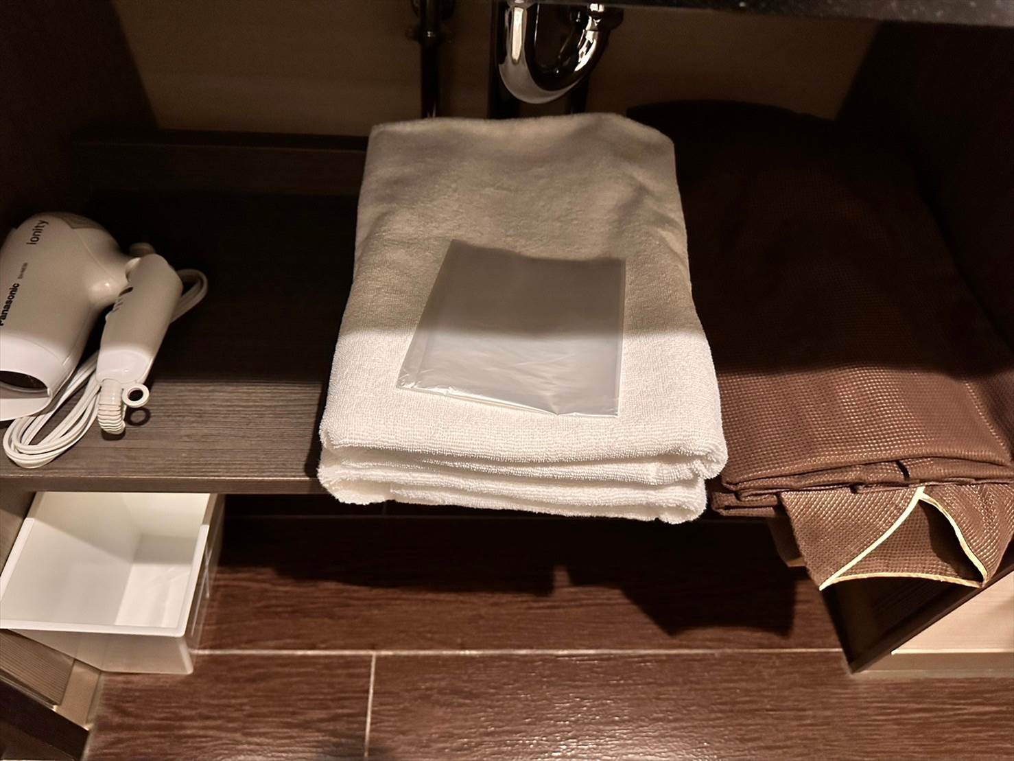 ▲洗面スペースの棚に、ルームウェア・バスタオル・ドライヤーが用意されていました。